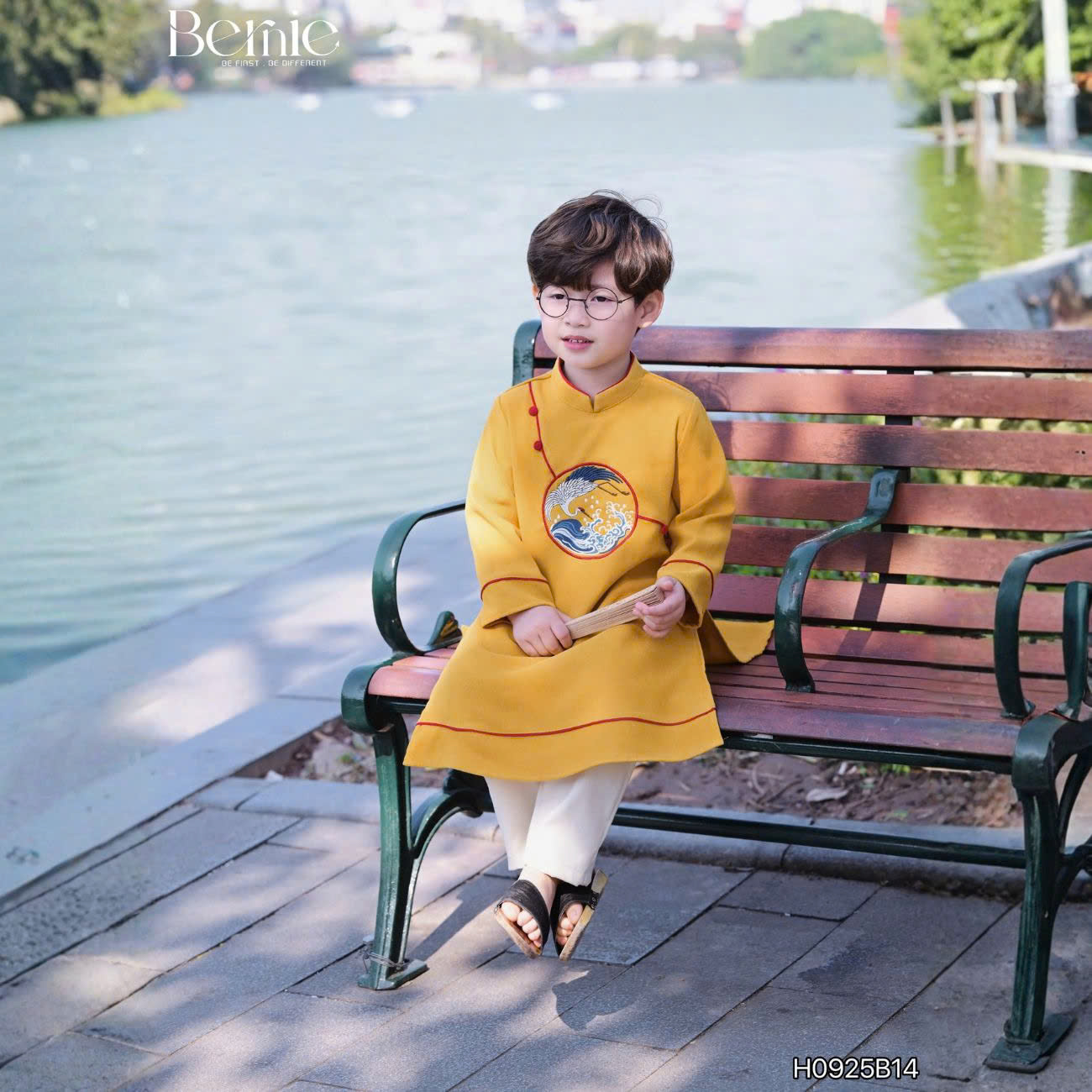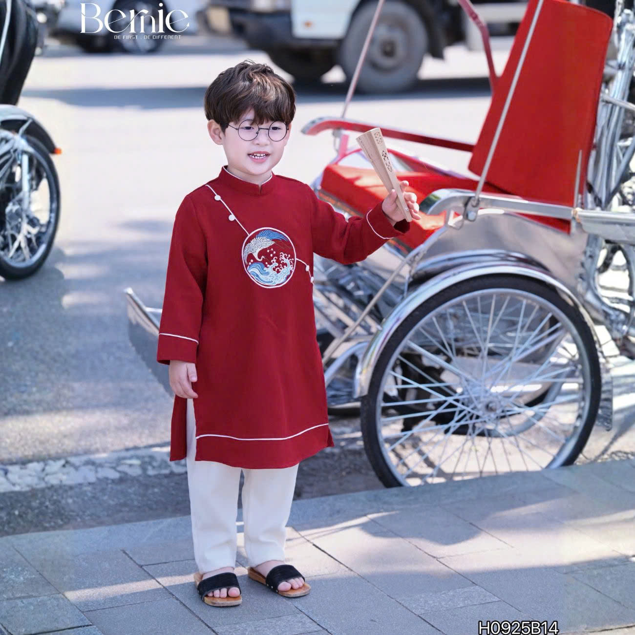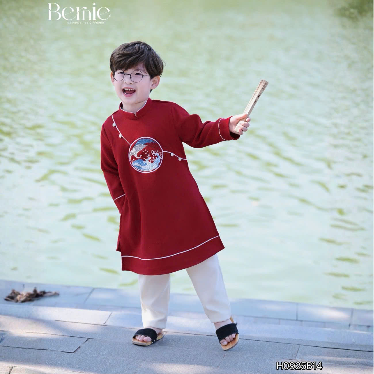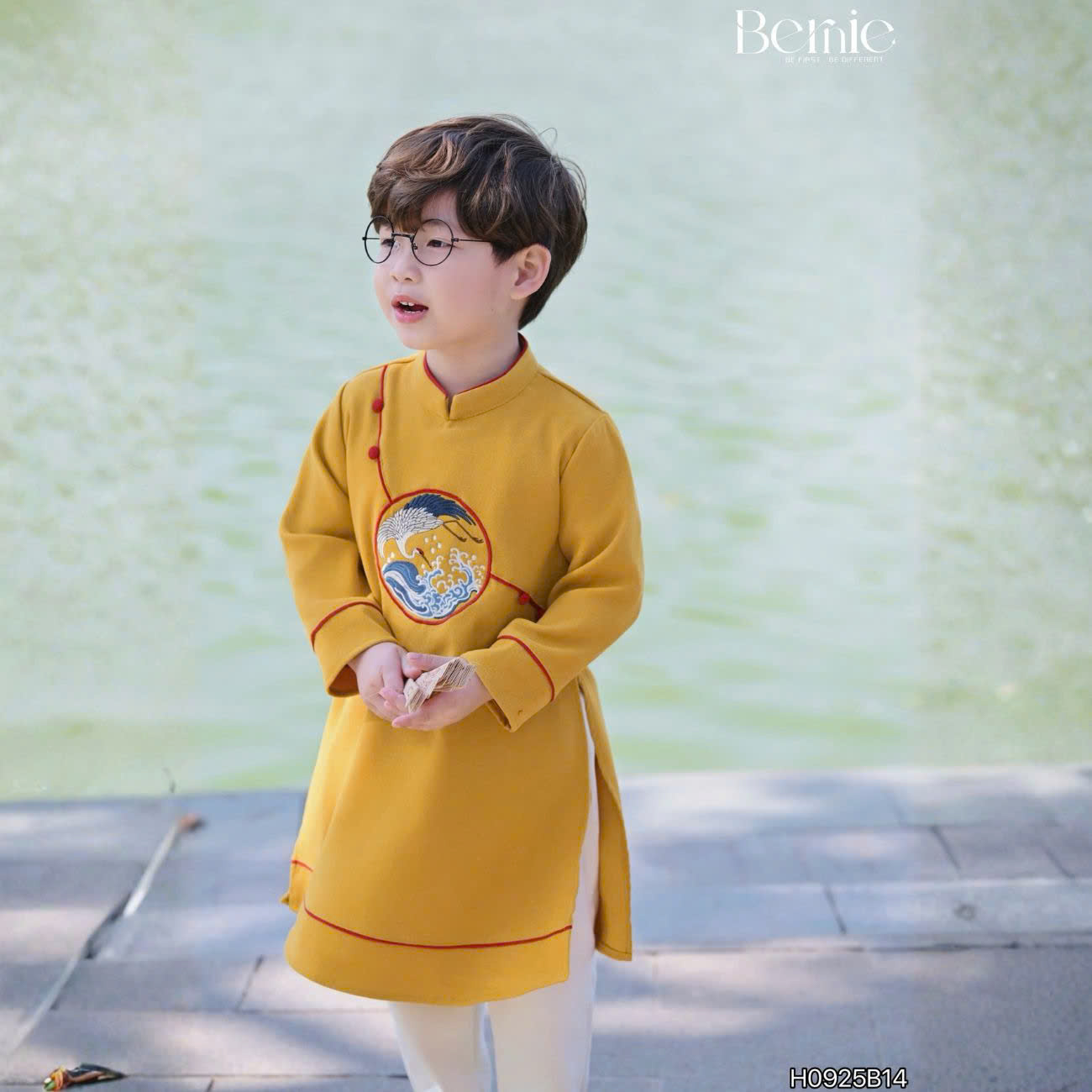- Thiết kế: Set áo dài cách tân Hạc vũ cho bé trai mặc tết chất nhung tăm chéo mềm mịn size 9 đến 25kg BERNIE H0925B14 với thiết kế áo dài cách tân màu đỏ, màu xanh, màu vàng kết hợp quần trắng kem sang xịn, hoạ tiết hình thêu Hạc vũ sang trọng, phối lé nhấn nhá đẹp mắt, lên form nhìn lịch lãm, sang trọng.