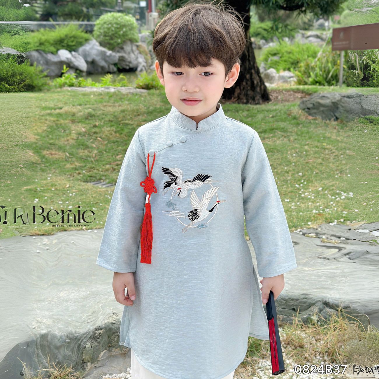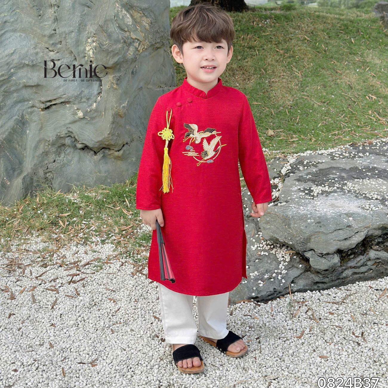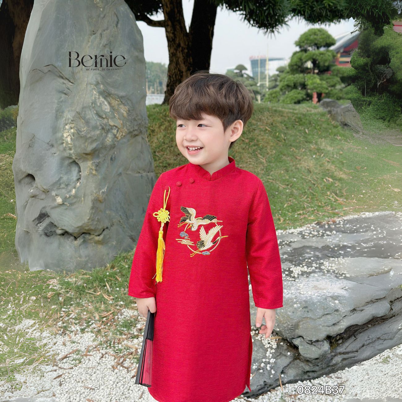 Tên sản phẩm: Áo dài cách tân bé trai mặc tết chất tafta thêu hạc màu xanh màu đỏ cho bé trai 10 đến 25kg BERNIE 0824B37
