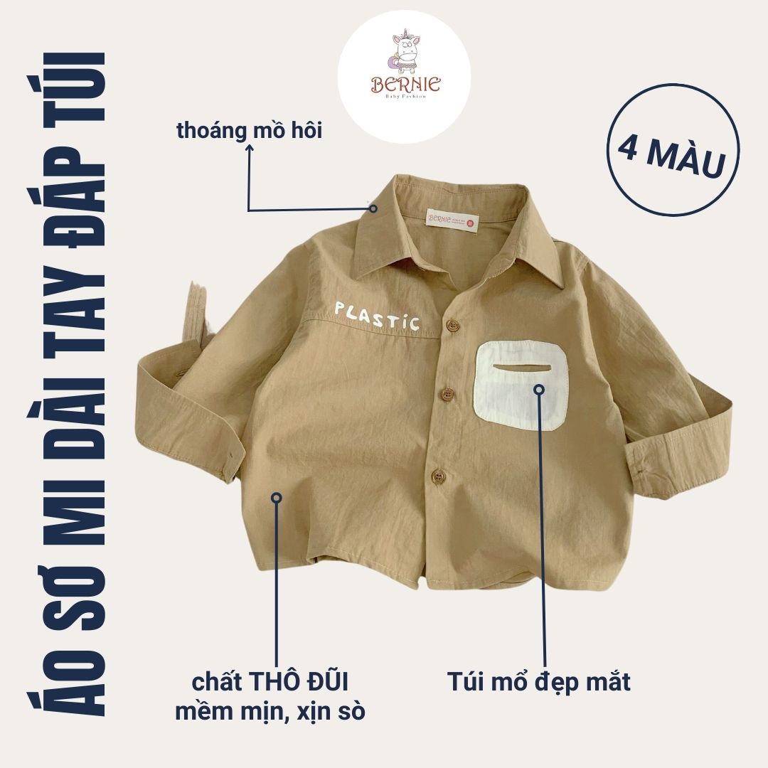 Áo sơ mi dài tay bé trai đáp túi plastic hàn quốc chất thô đũi mềm mại BERNIE cho bé 8 đến 24kg