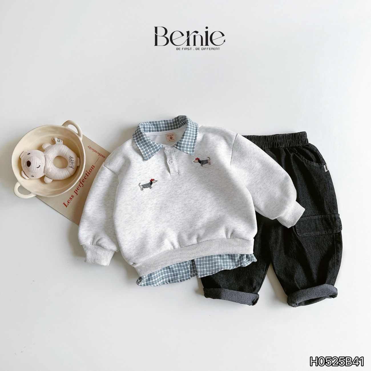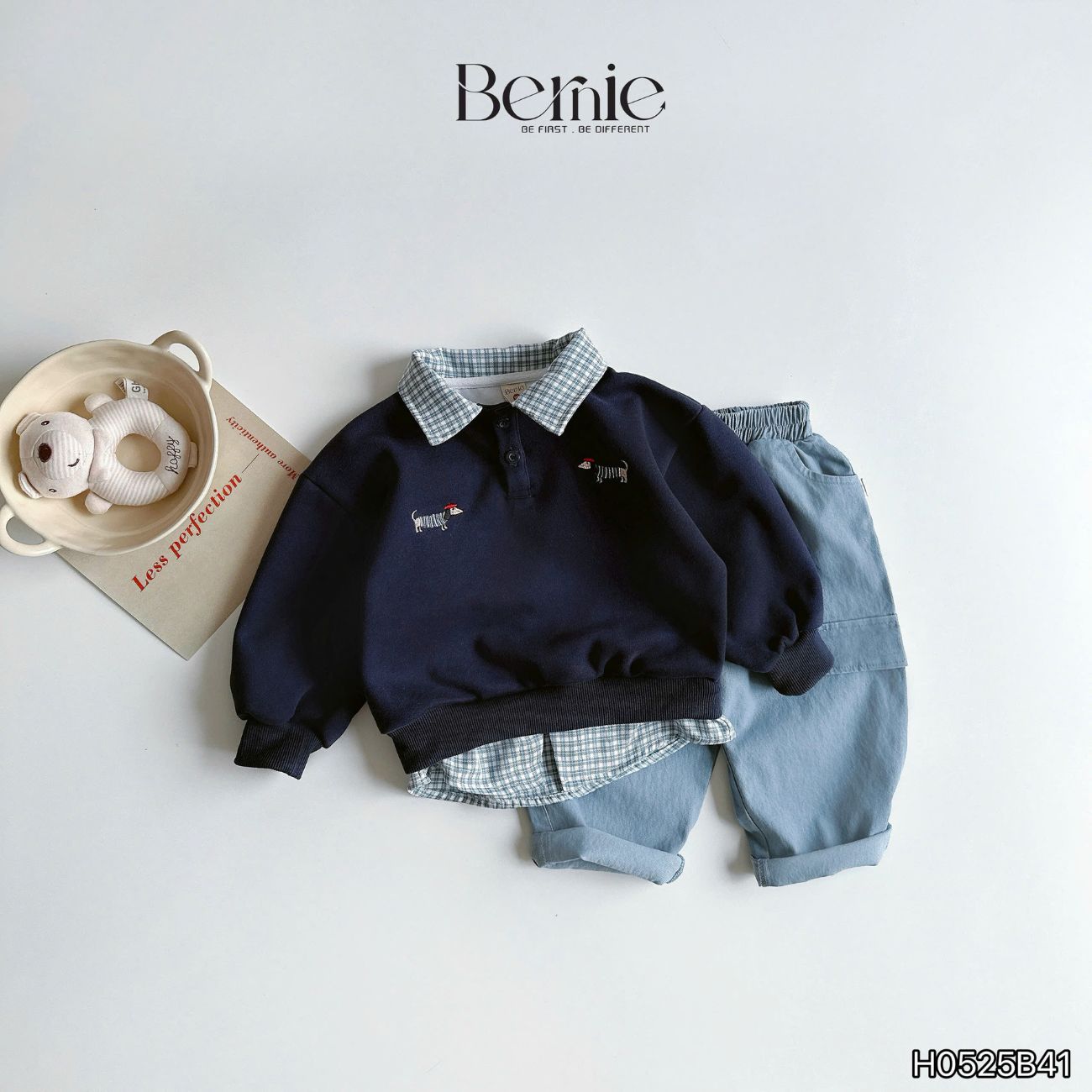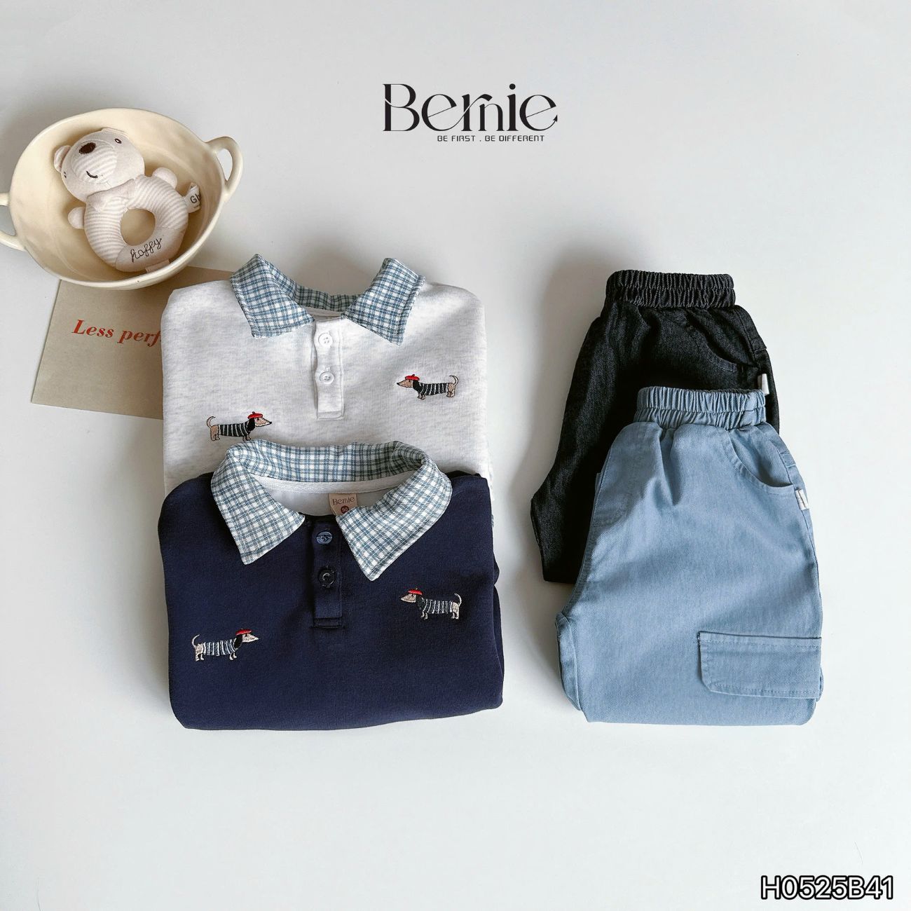 Set bộ nỉ tay dài phối cổ sơ mi sọc họa tiết thêu cún dễ thương kèm quần dài cho bé trai size 1 đến 7 tuổi BERNIE H0525B41