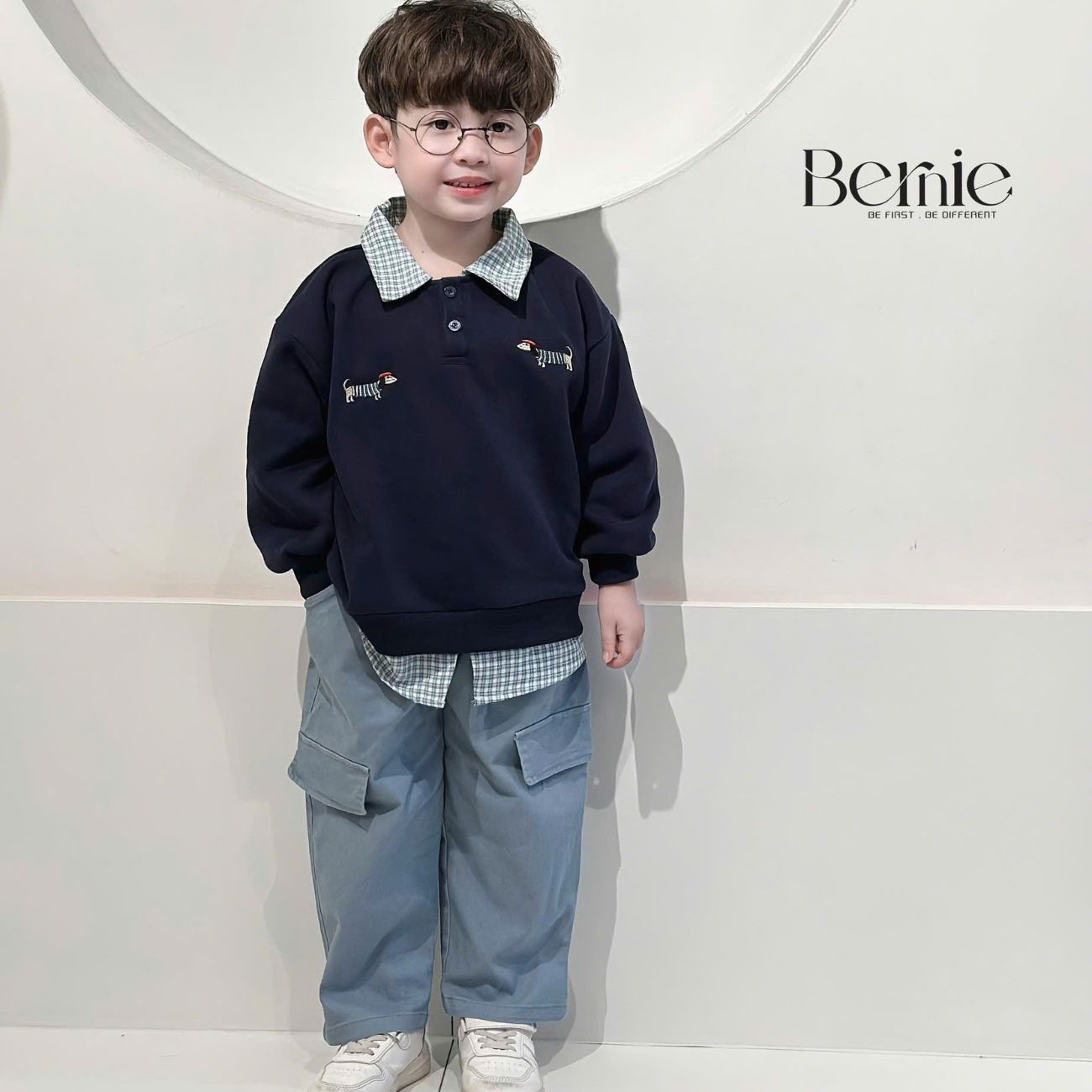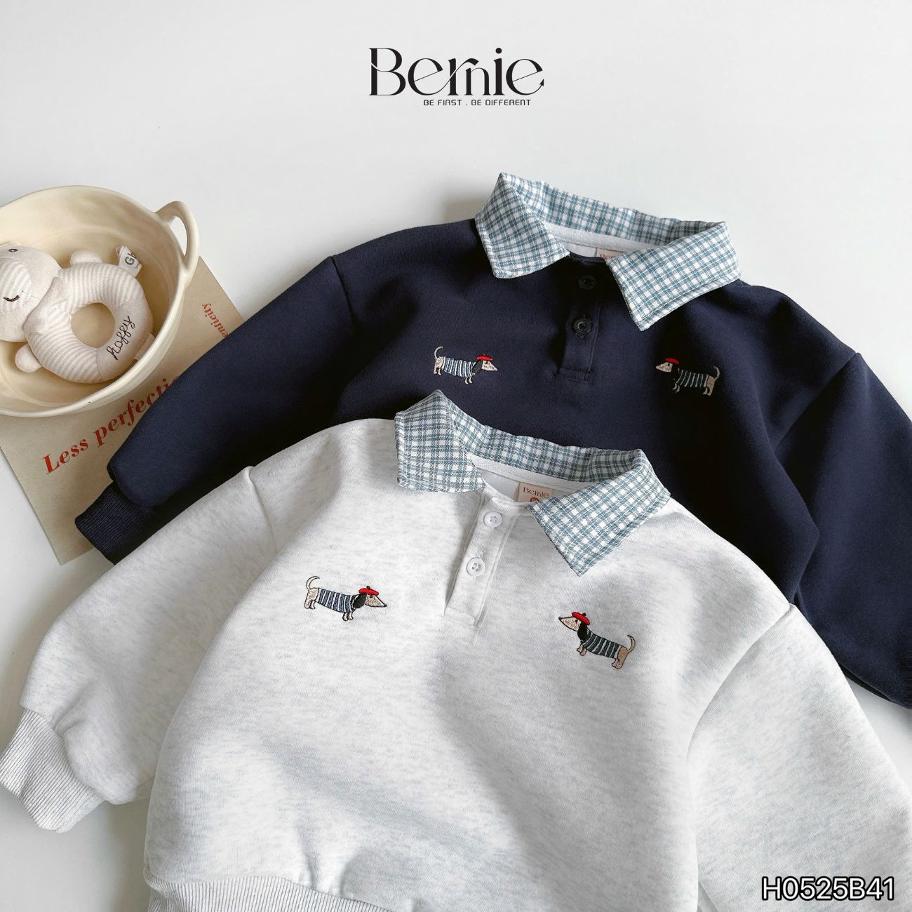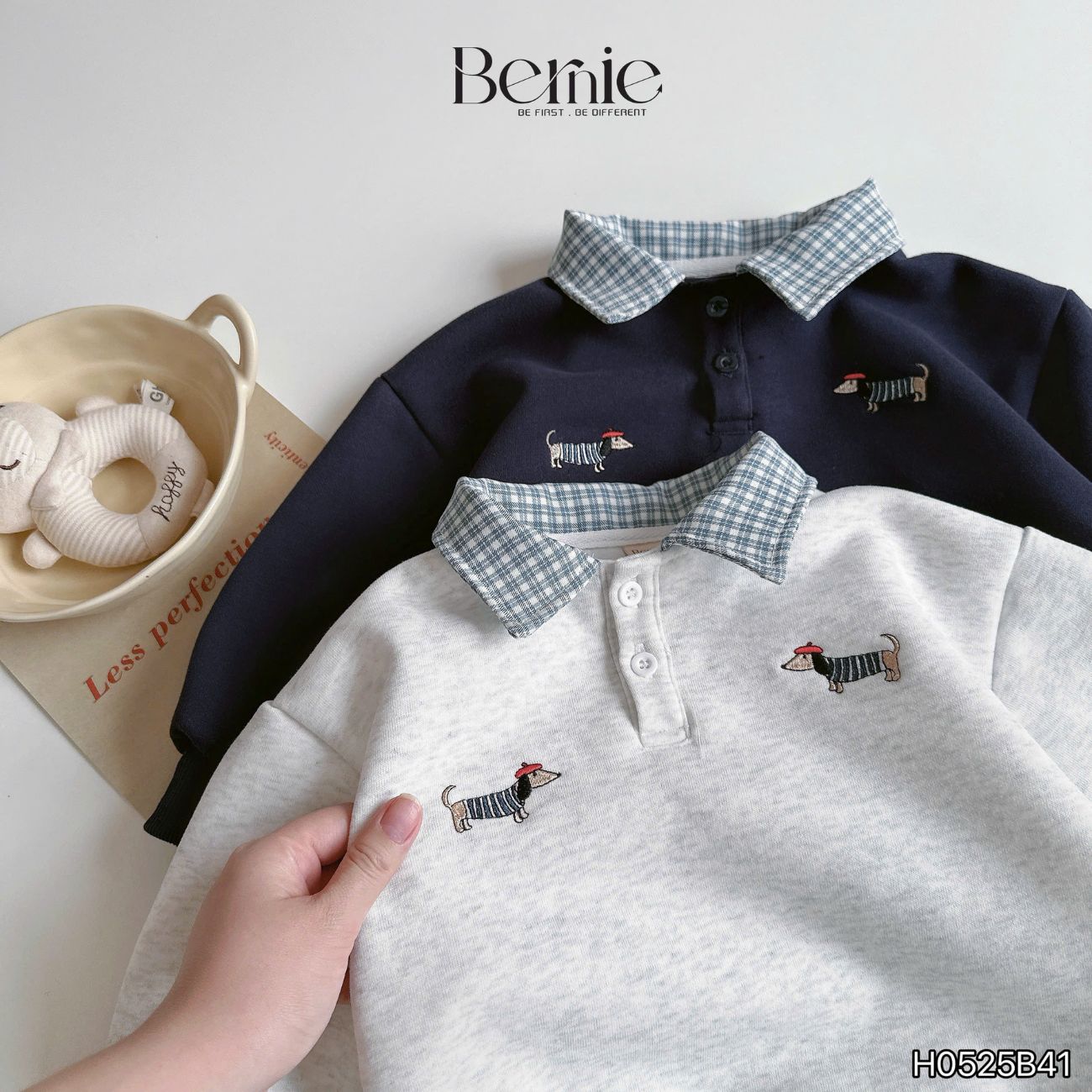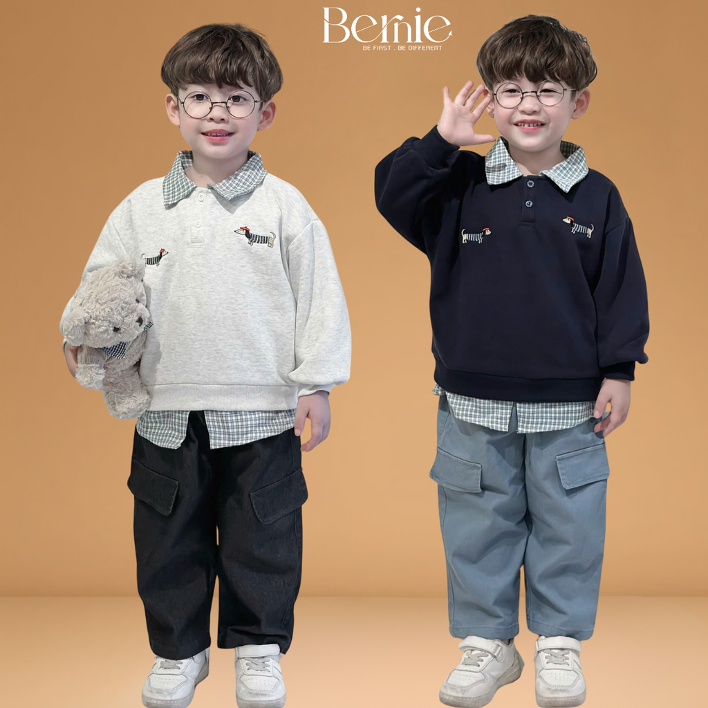 Set bộ nỉ tay dài phối cổ sơ mi sọc họa tiết thêu cún dễ thương kèm quần dài cho bé trai size 1 đến 7 tuổi BERNIE H0525B41