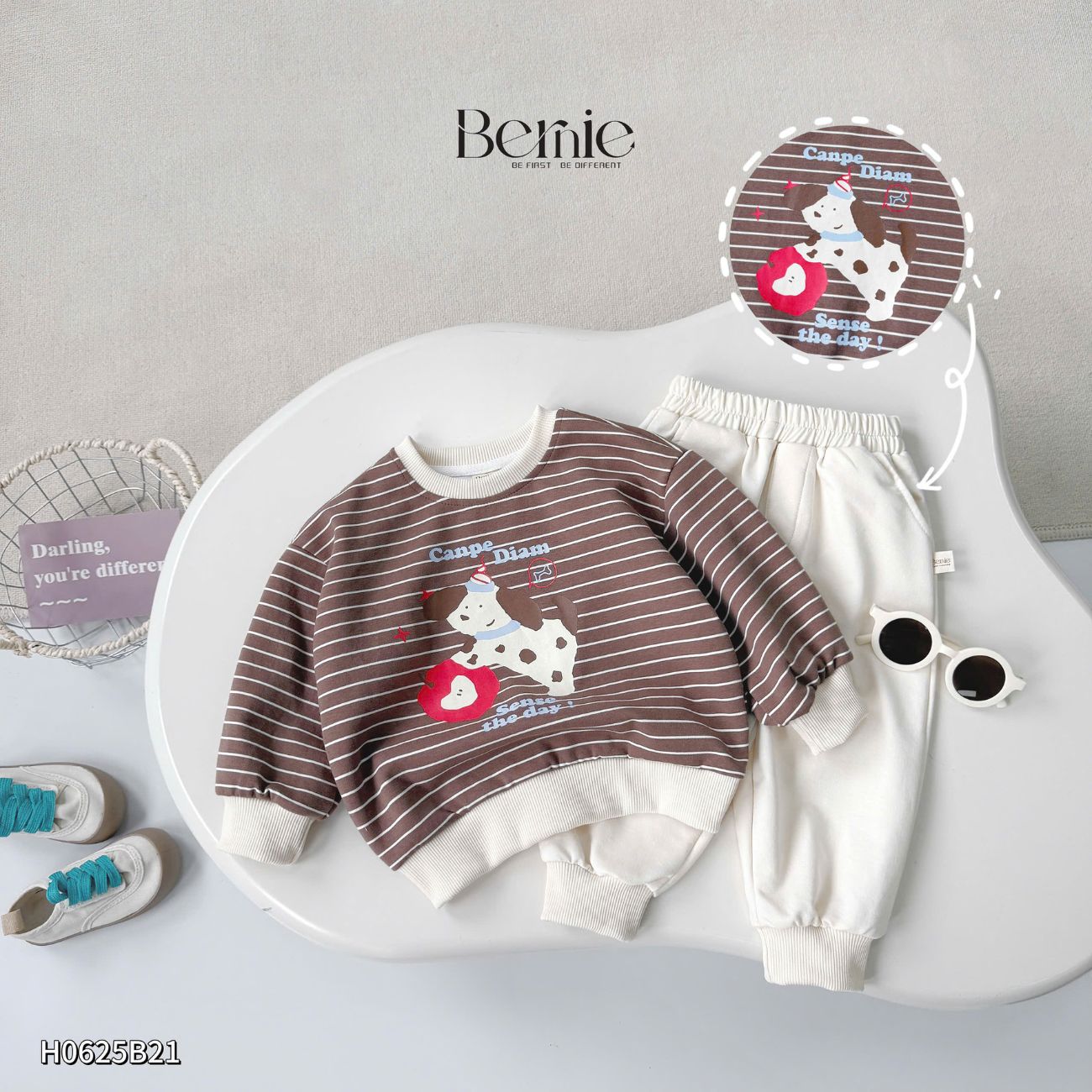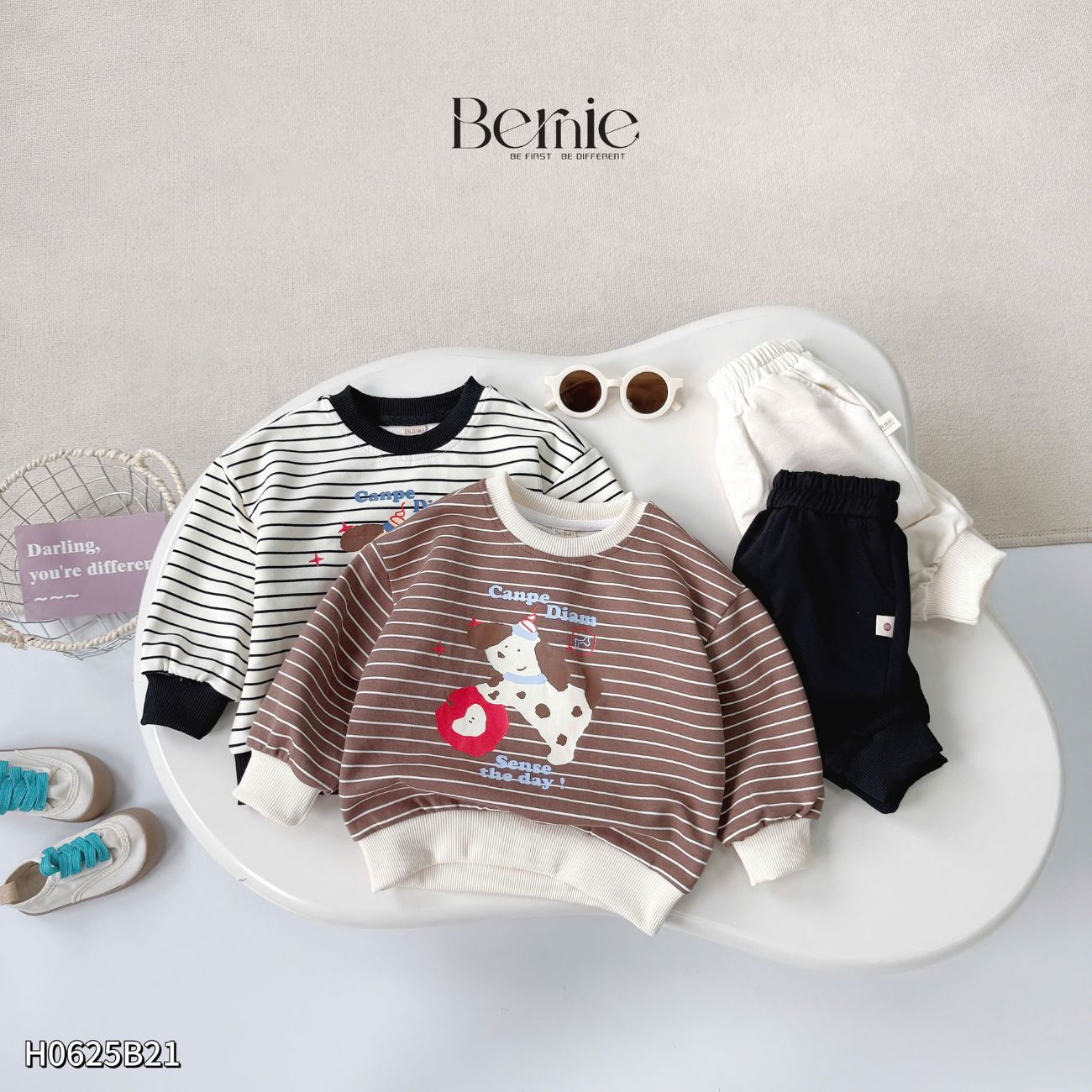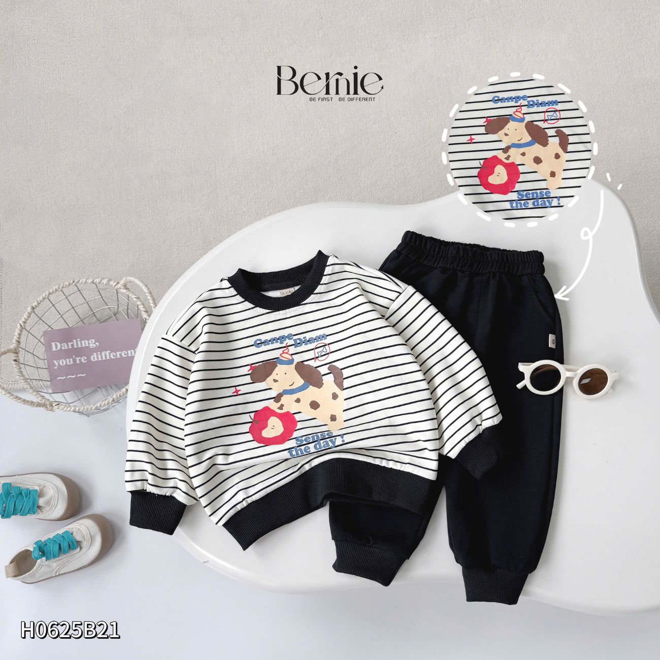 Set bộ nỉ tay dài kẻ sọc ngang phối màu họa tiết hình in cún dễ thương kèm quần dài unisex bé trai bé gái size 1 đến 7 tuổi BERNIE H0625B21