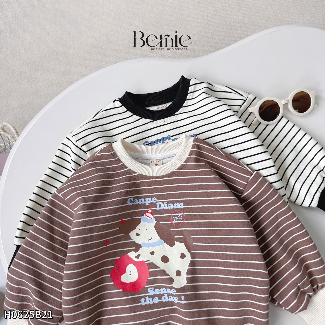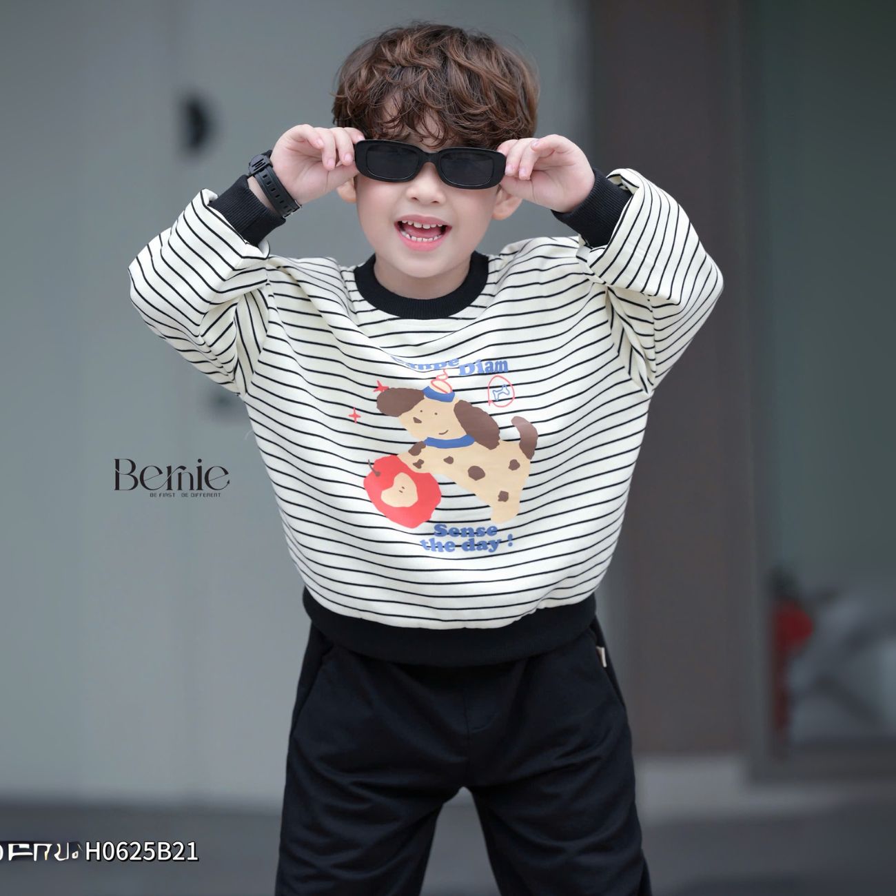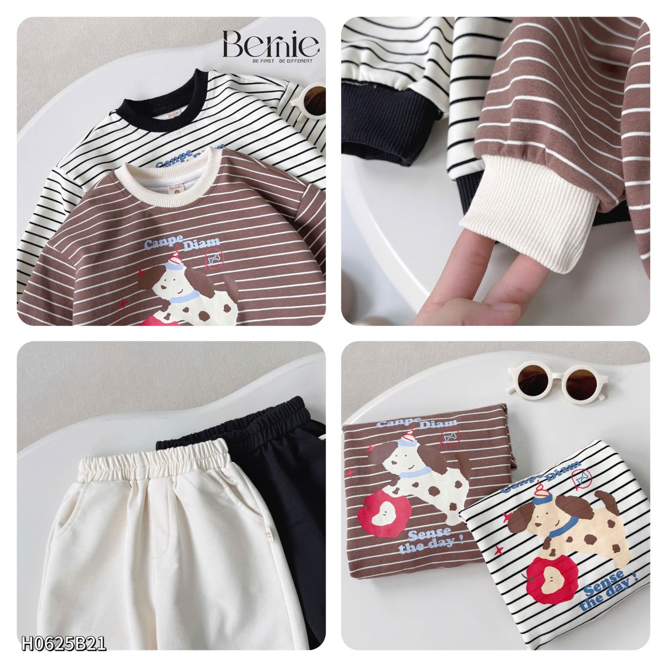 Set bộ nỉ tay dài kẻ sọc ngang phối màu họa tiết hình in cún dễ thương kèm quần dài unisex bé trai bé gái size 1 đến 7 tuổi BERNIE H0625B21