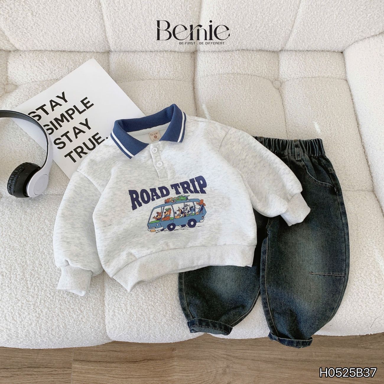 - Chất liệu: Set bộ tay dài, set polo nỉ thu đông tay dài cho bé trai BERNIE Kids có chất liệu áo polo nỉ 2 da mềm mịn, quần jean xịn sò. đứng phom