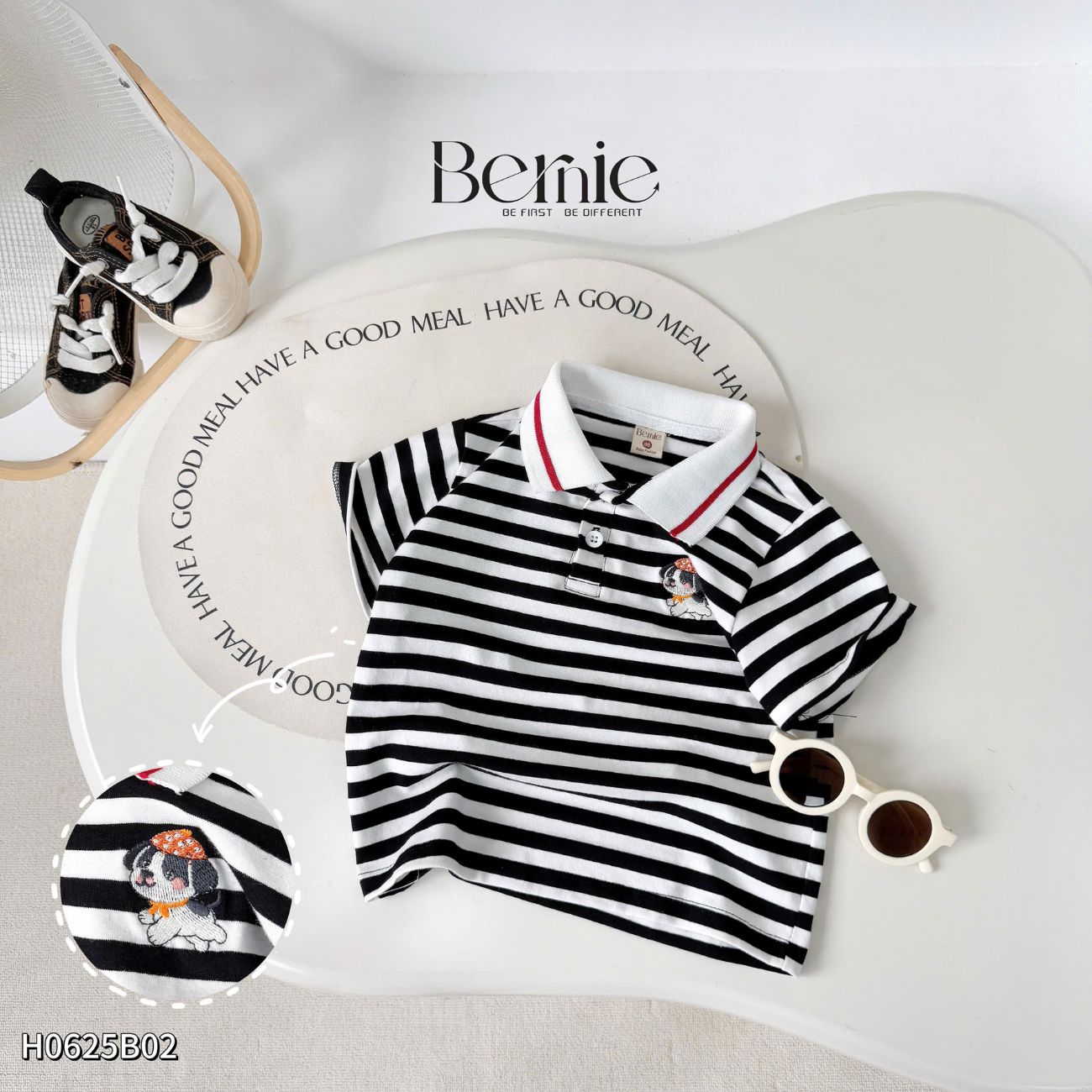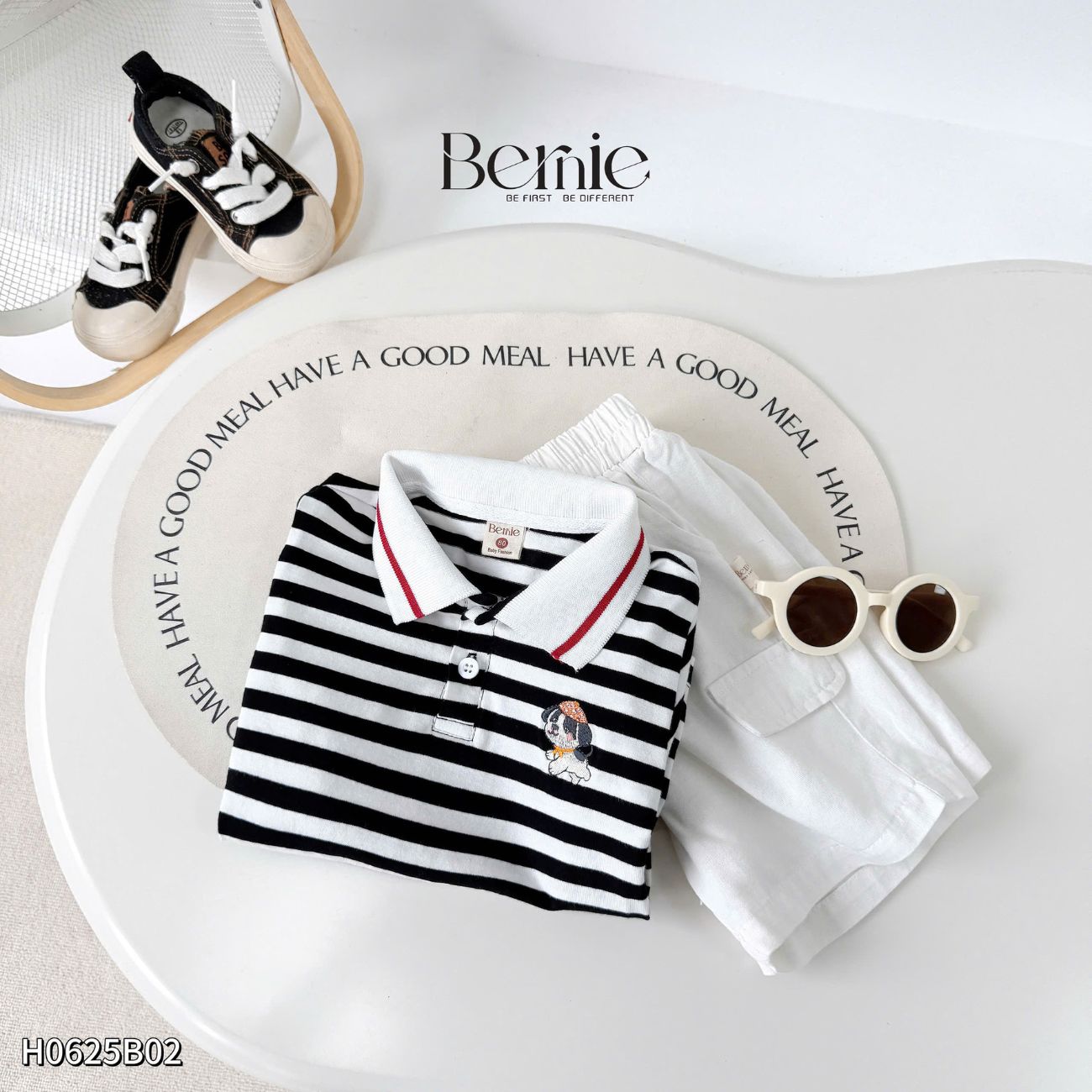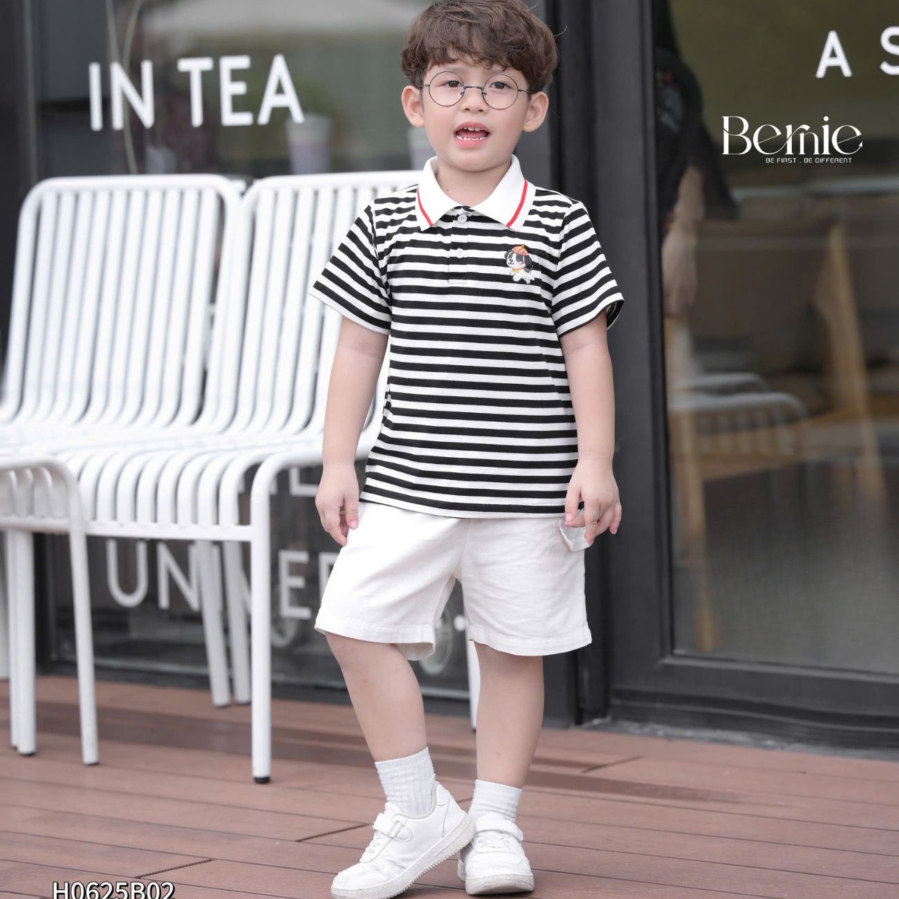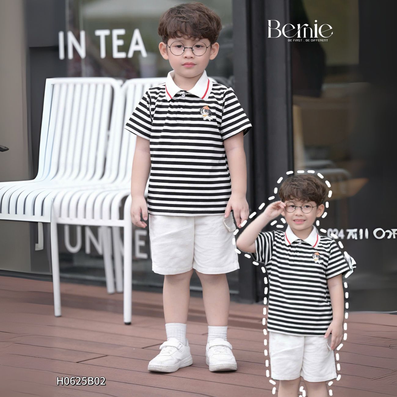 Set bộ polo kẻ đen phối màu thêu cún kèm quần short kaki cho bé trai 1 đến 7 tuổi BERNIE H0625B02