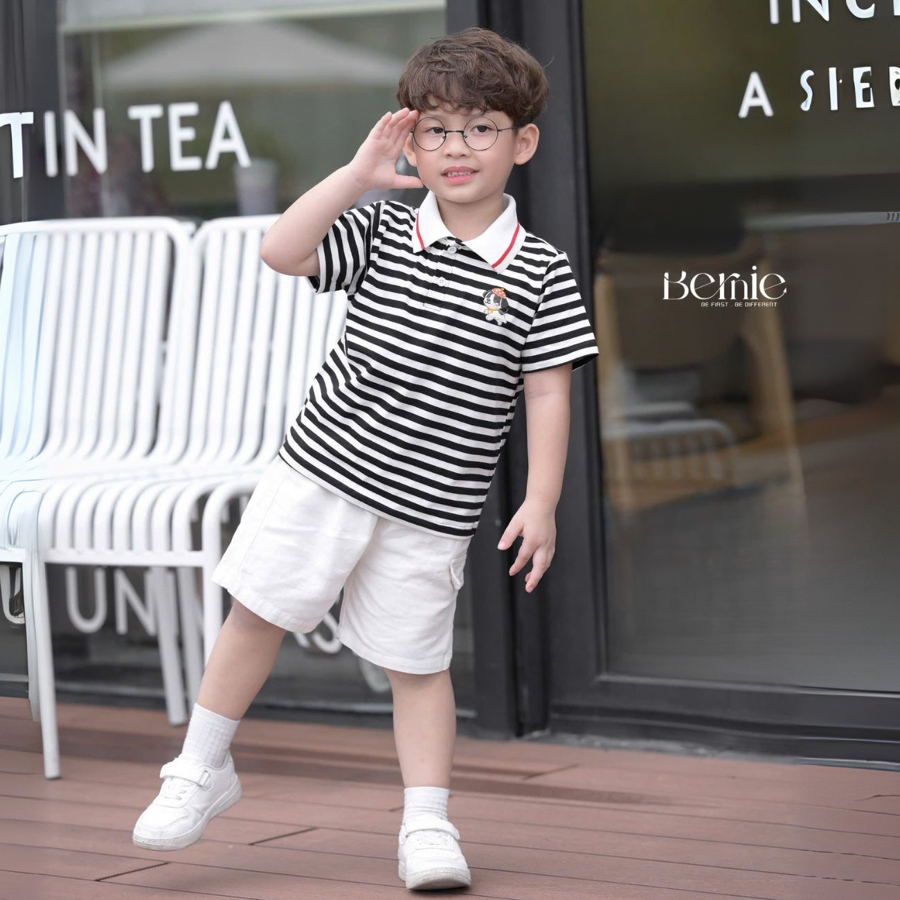- Chất liệu: Set bộ polo bé trai, set bộ tay ngắn kẻ ngang màu đen thêu cún cho bé trai Bernie với chất liệu áo polo cotton co dãn thoải mái cho bé khi mặc, phối quần kaki mềm mịn sịn sò