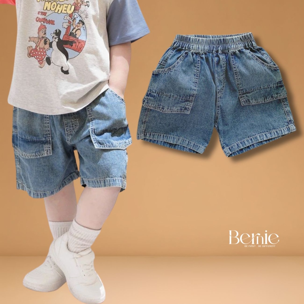 Quần short quần jean đùi phối túi hộp 2 bên cho bé trai với lưng quần bản chun co giãn tốt , thoải mái vận động không lo hằn bụng bé yêu