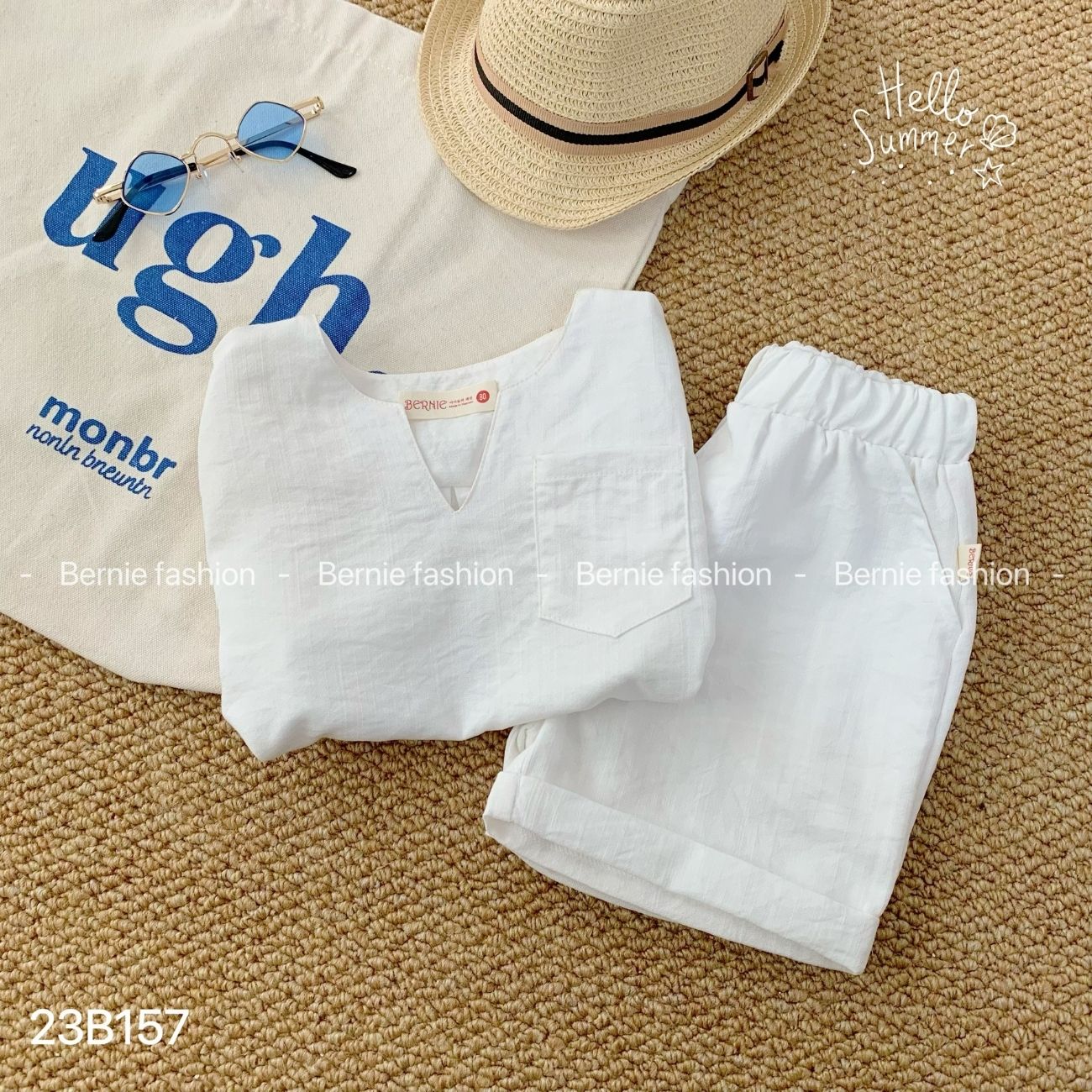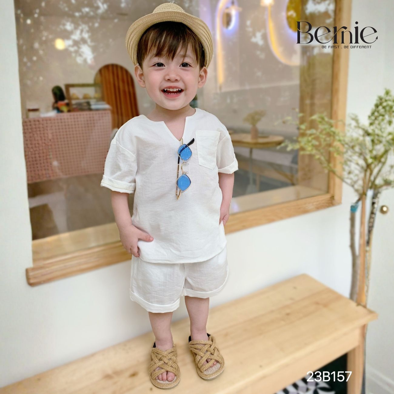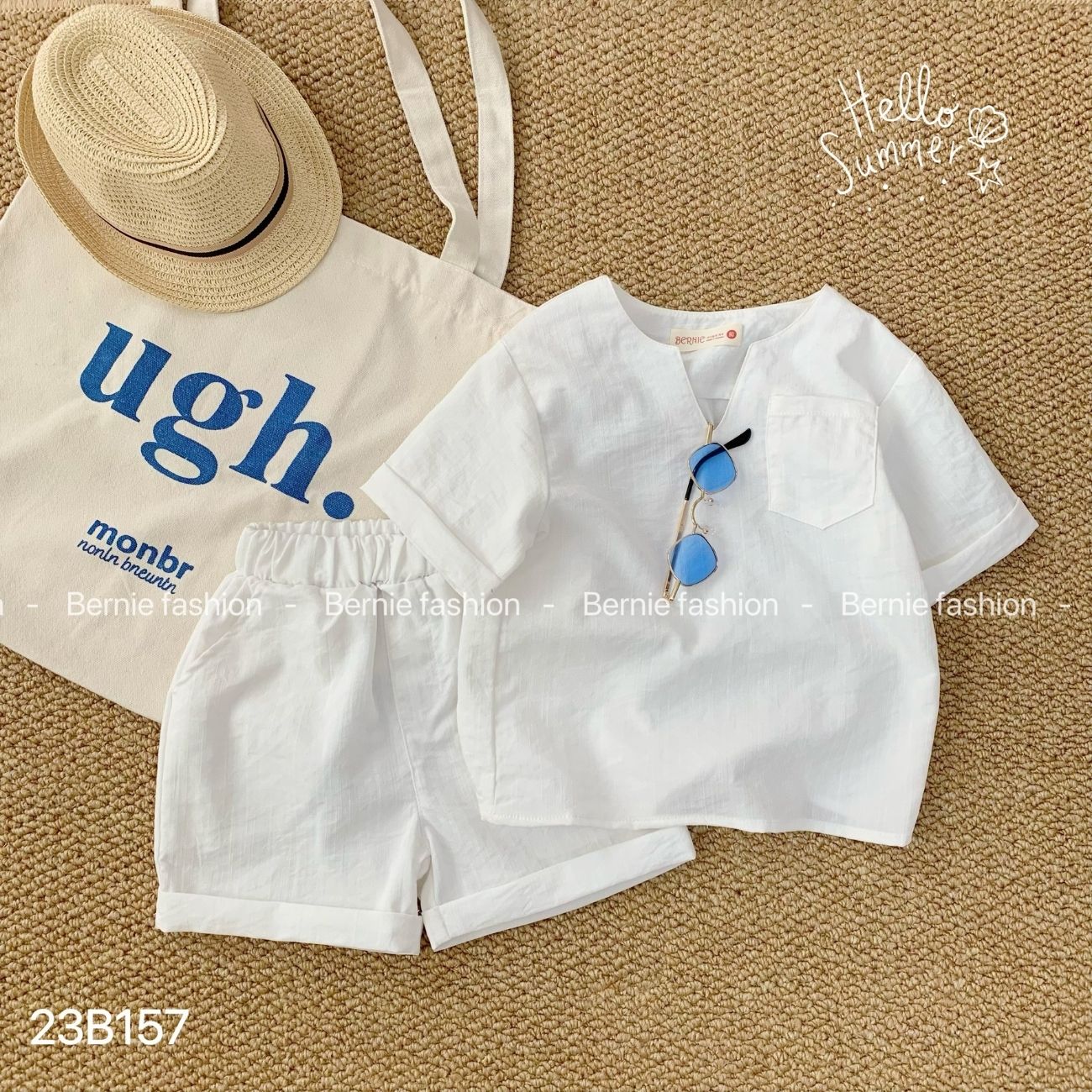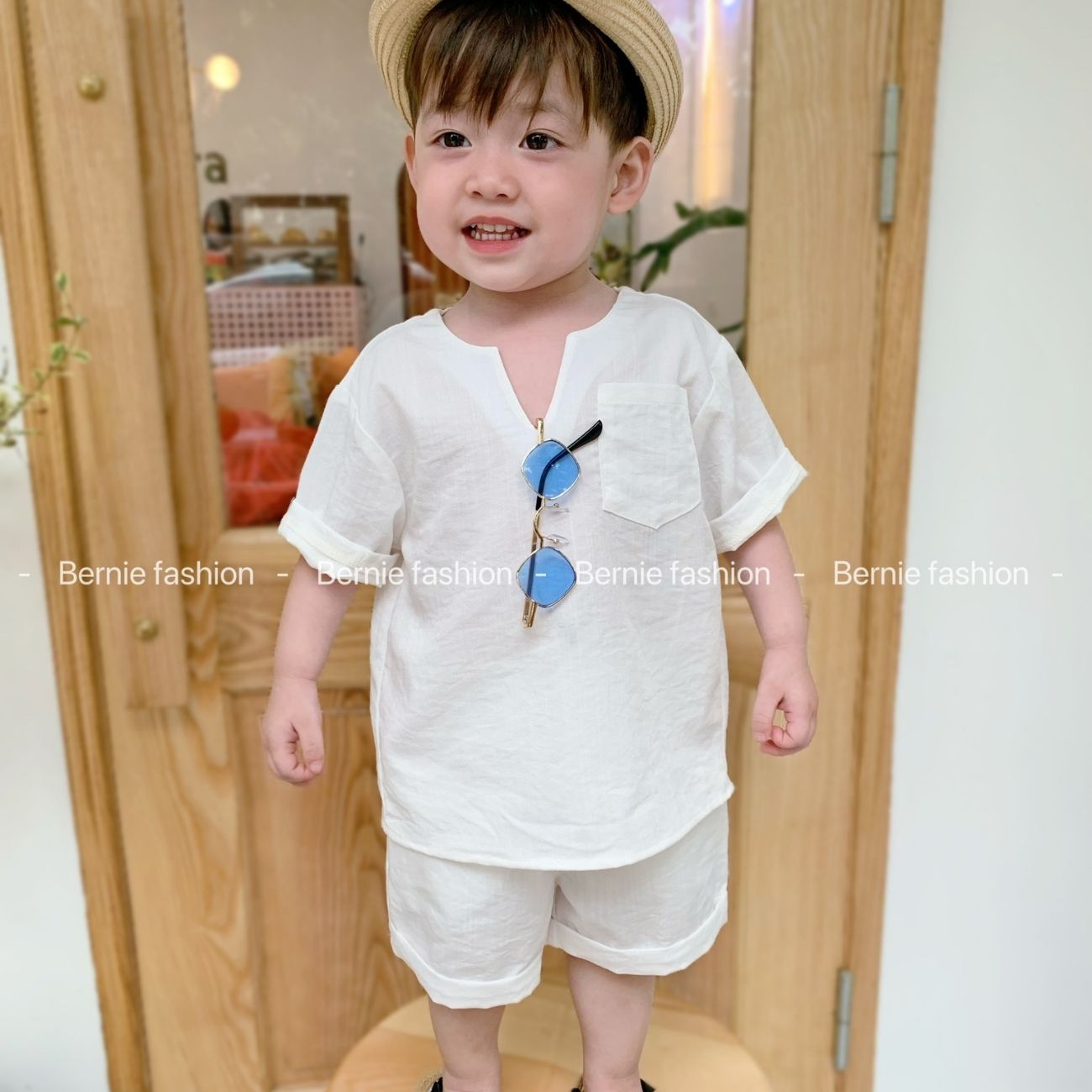 Tên sản phẩm: Set sơ mi bé trai màu trắng chất đũi bé mặc đi biển bộ quần áo đi chơi sành điệu 1 đến 7 tuổi BERNIE