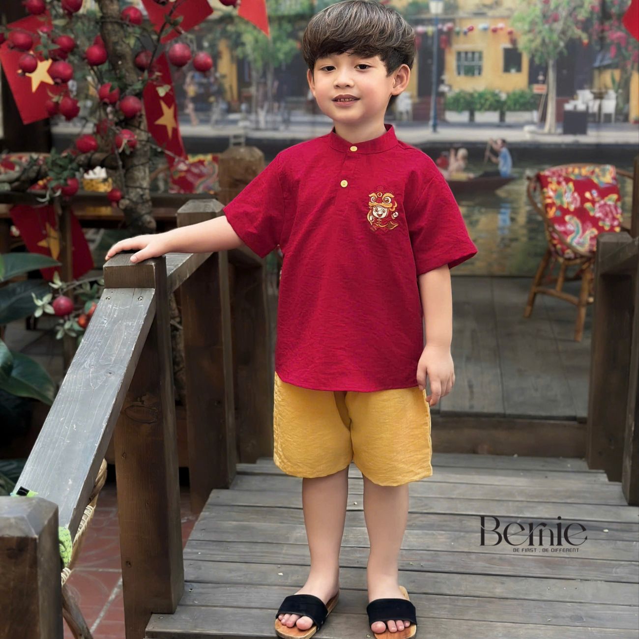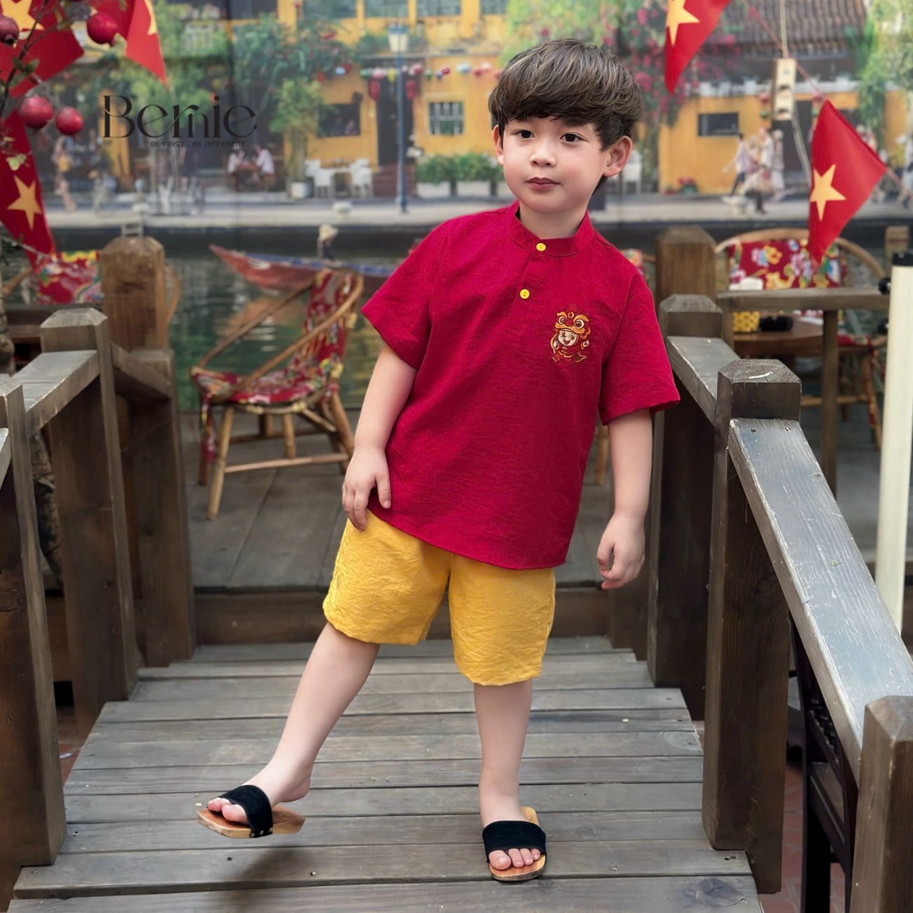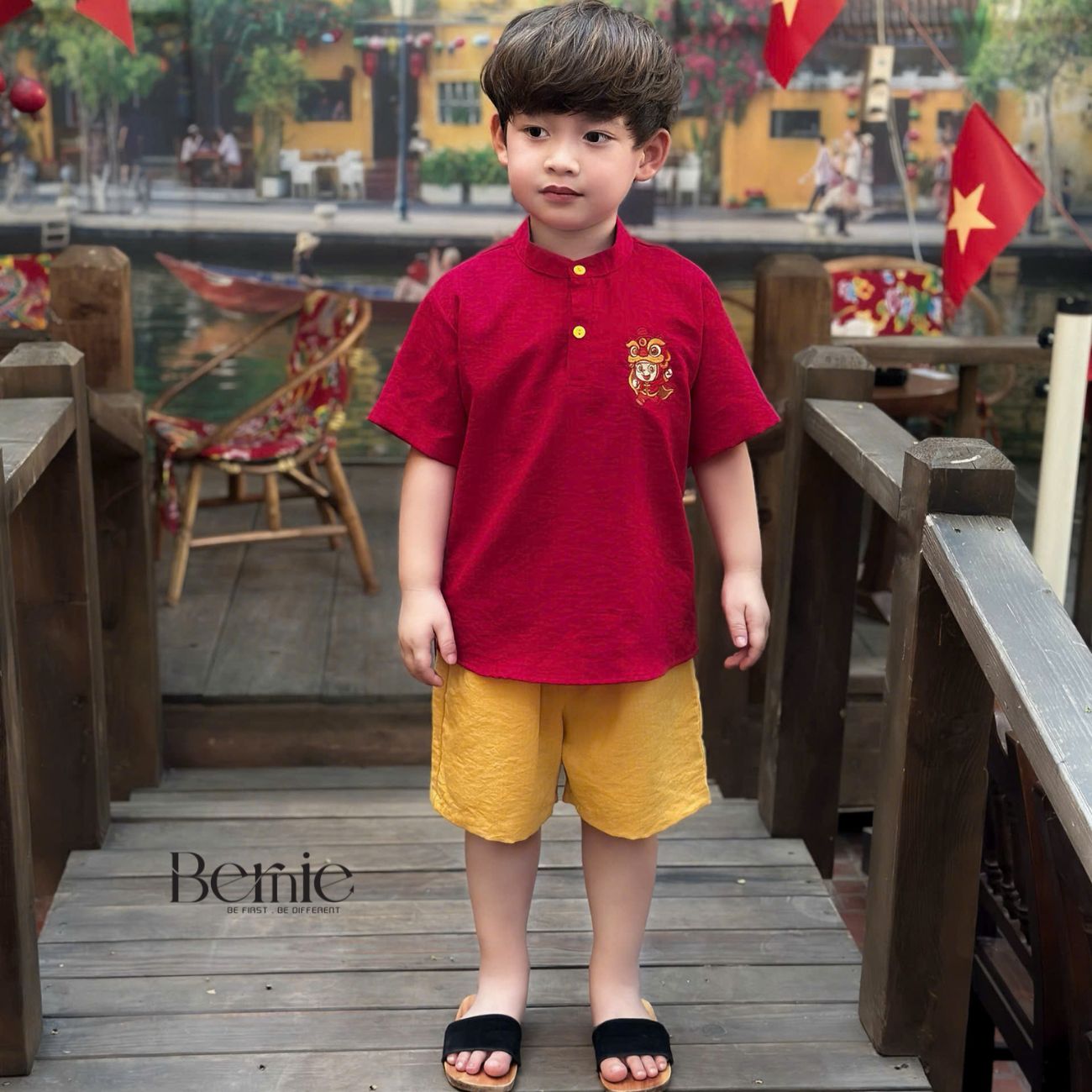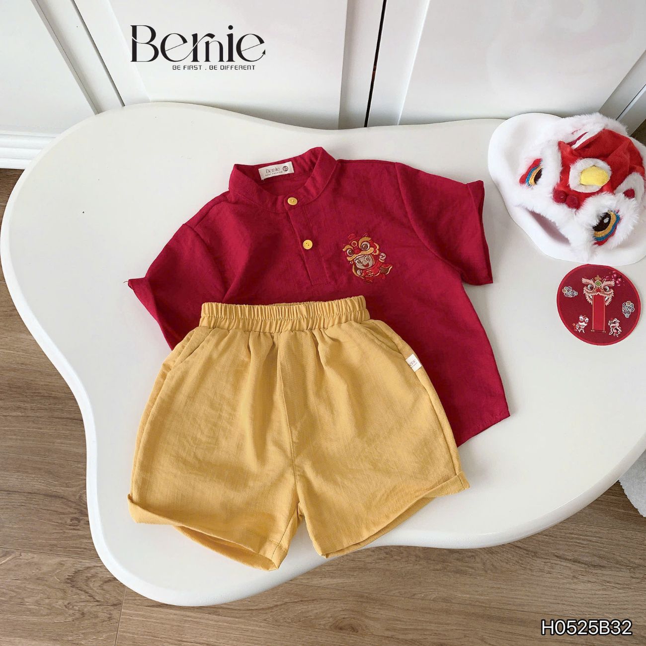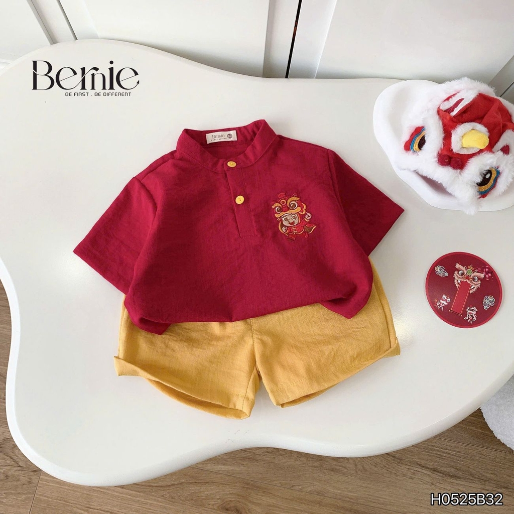 Tên sản phẩm: Set bộ sơ mi cổ trụ chất đũi cộc tay cho bé trai họa tiết mua Lân trung thu và Tết size 9 tới 28kg BERNIE H0525B32