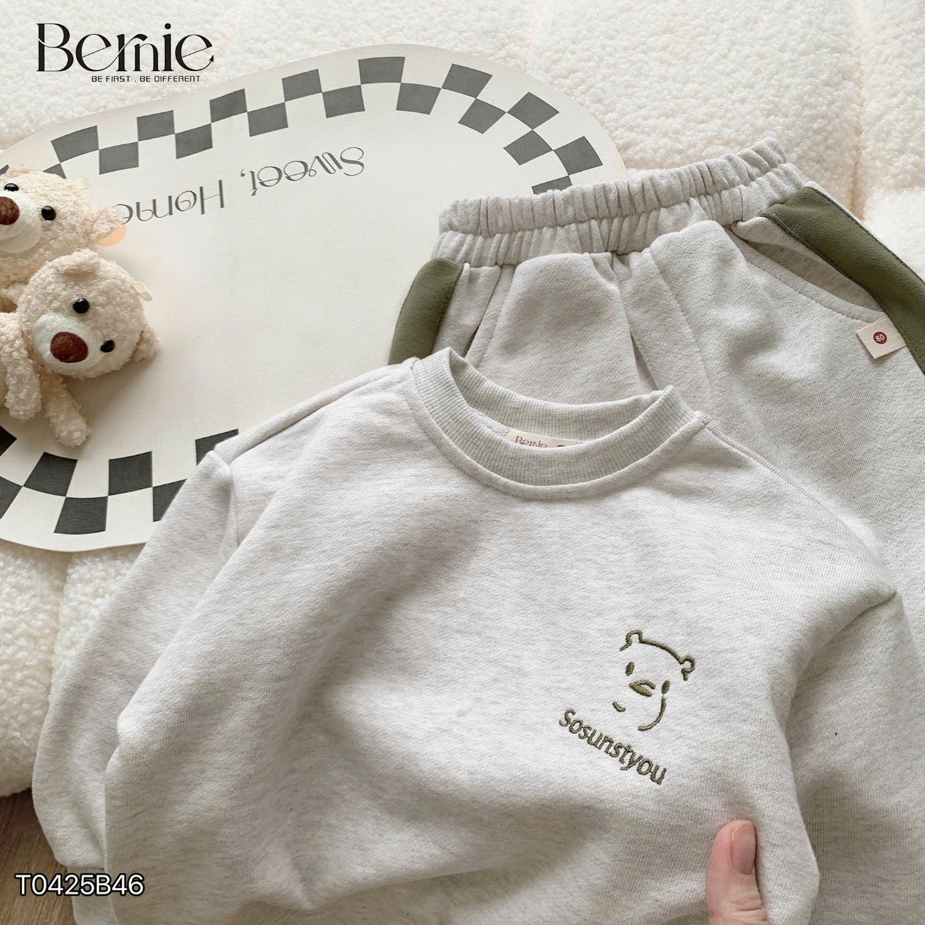 Set bộ dài chất da cá họa tiết thêu gấu kèm quần dài phối sọc rêu cho bé trai size 1 đến 7 tuổi BERNIE T0425B46