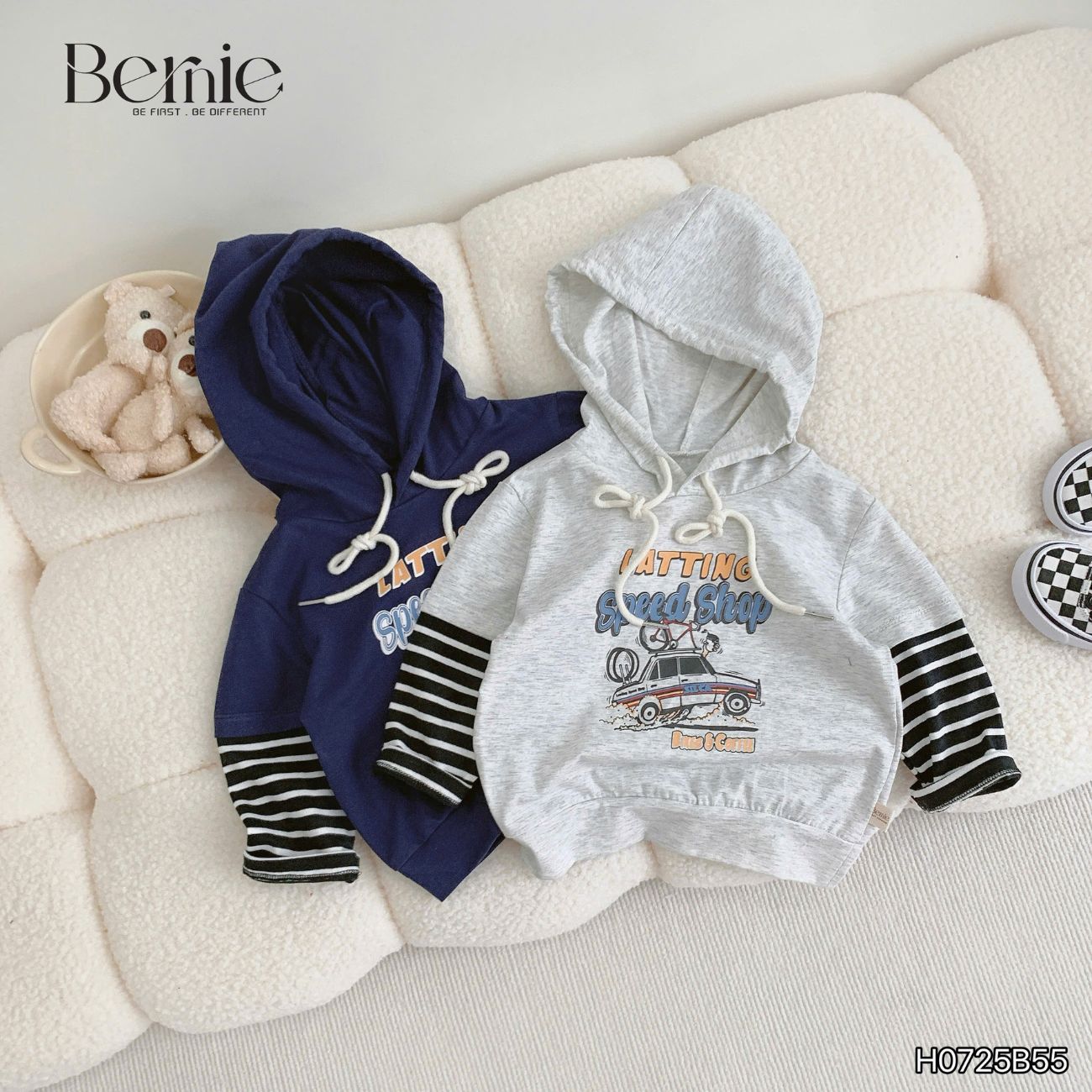 Set bộ tay dài thể thao unisex tay áo phối kẻ áo có mũ họa tiết ô tô đi chơi đi học 1 đến 7 tuổi BERNIE H0725B55