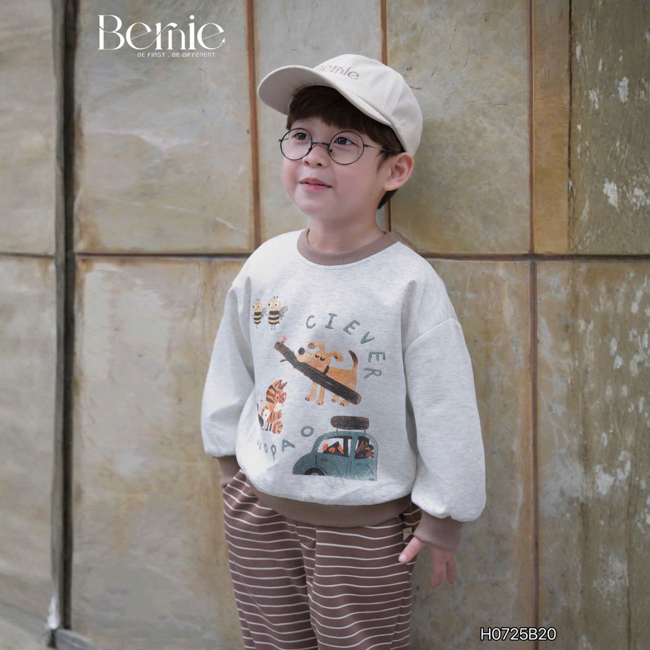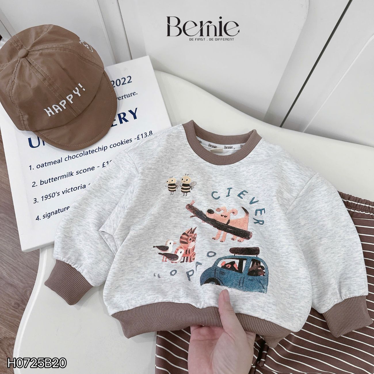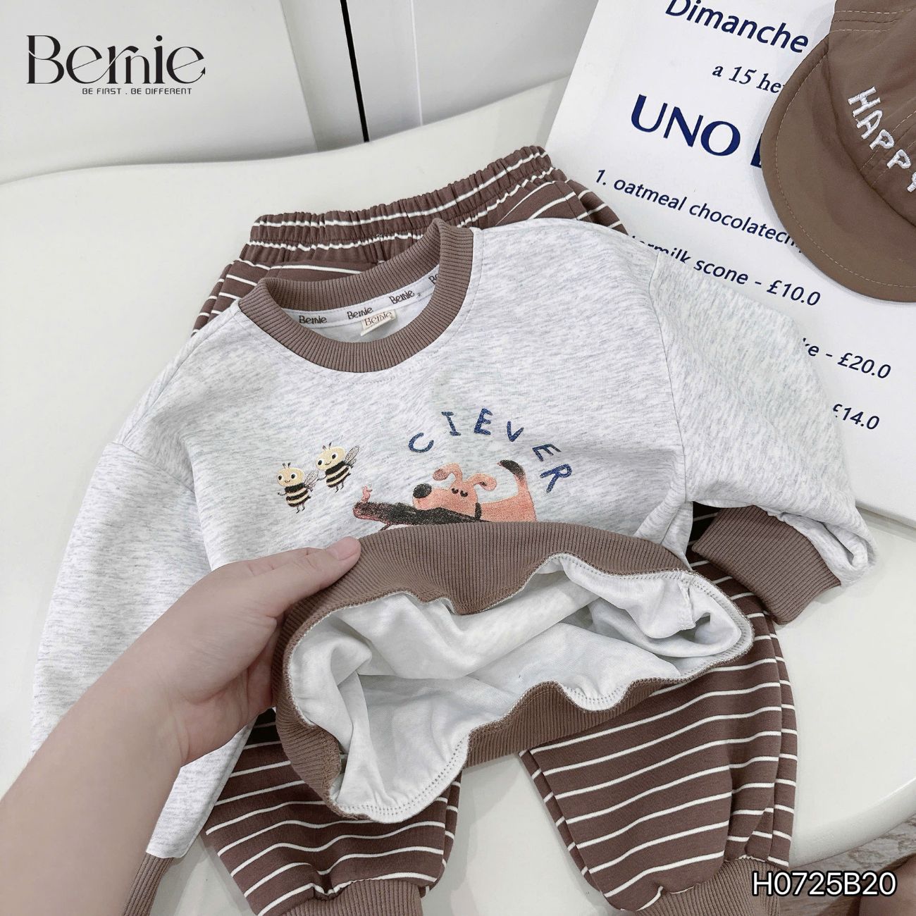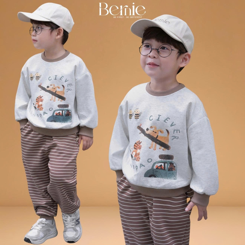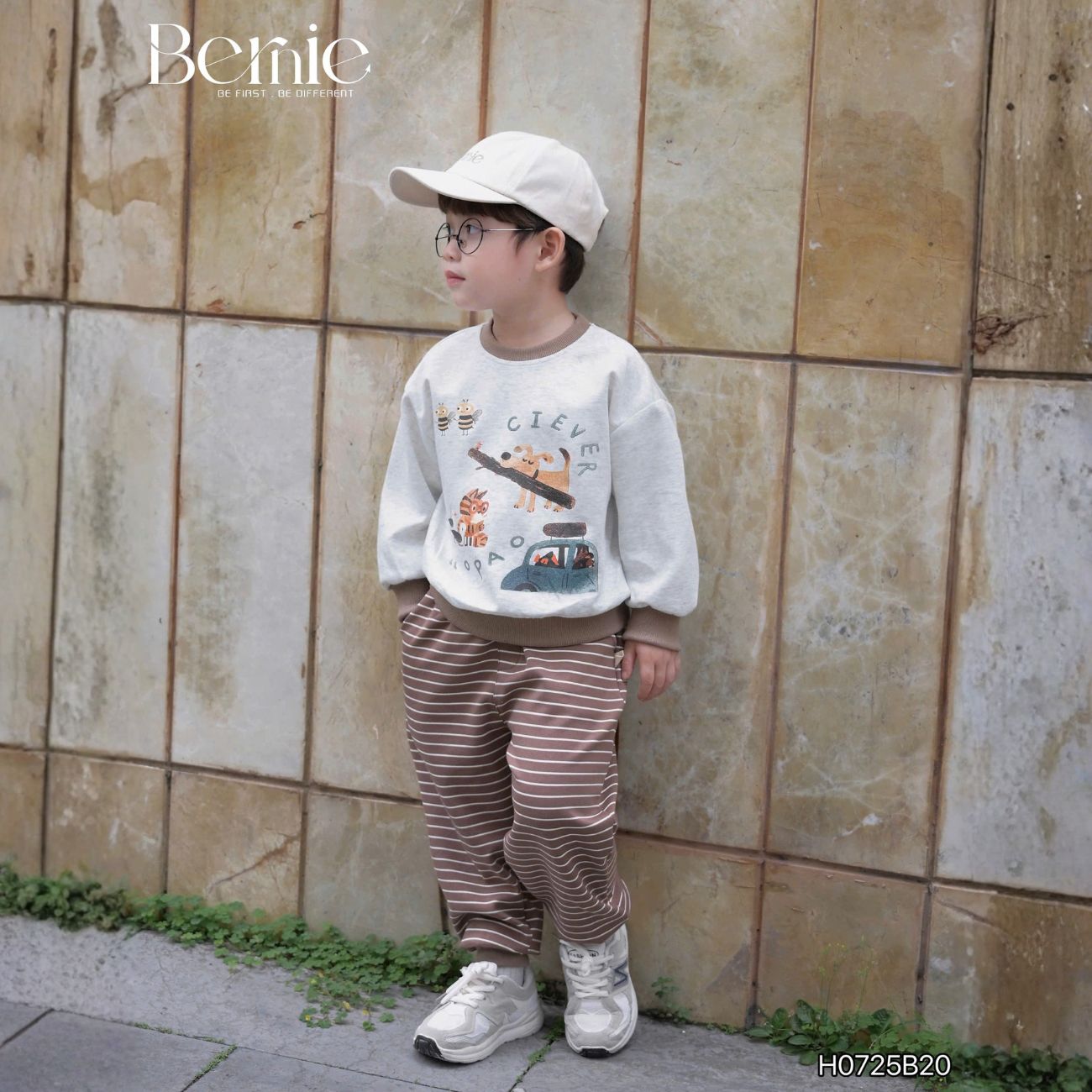 Set bộ nỉ dài tay họa tiết hoạt hình Clever kèm quần dài kẻ ngang cho bé trai size 9 tới 28kg BERNIE H0725B20