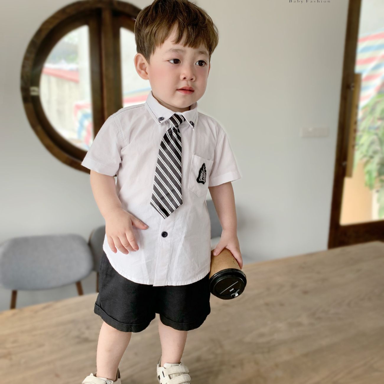 Mô tả: set bộ 3 chi tiết áo sơ mi trắng có túi, đính huy hiệu kèm cà vạt và quần short hàn quốc cho bé từ 9 đến 24kg thiết kế sang chảnh, cá tính, năng động, cá tính, cool ngầu bé mặc đi tất niên, tổng kết, diễn văn nghệ, đón tết, du xuân đều đẹp, đi chơi, đi tiệc, đi đám cưới đều xinh