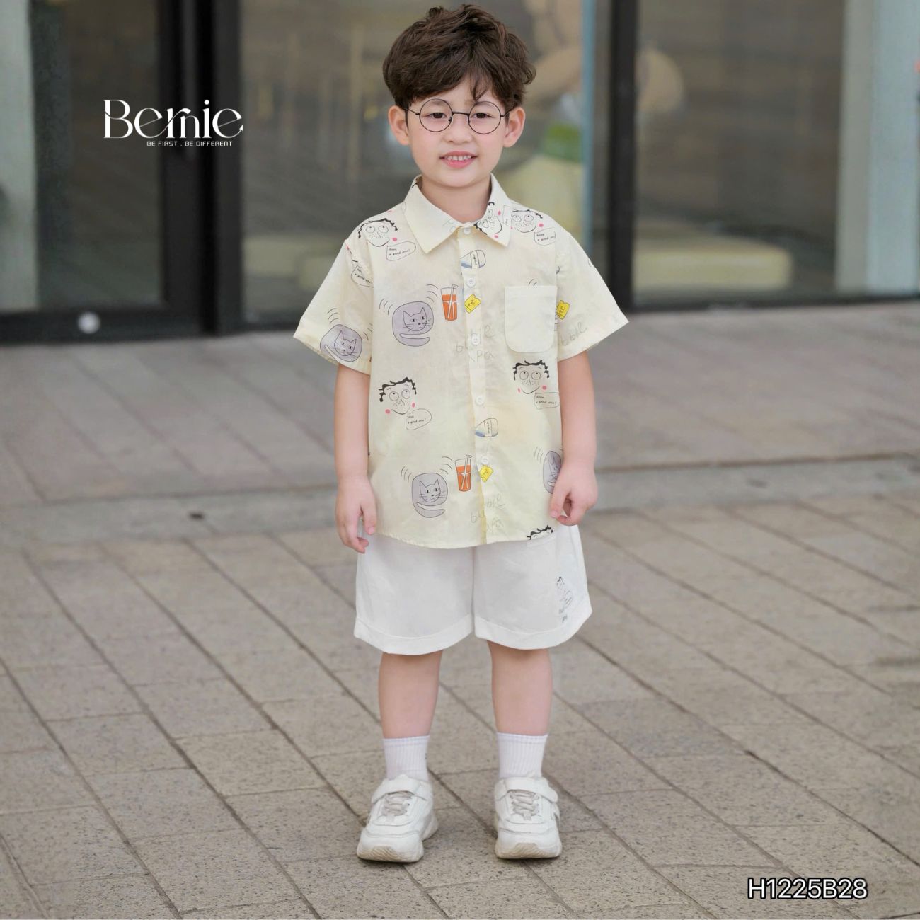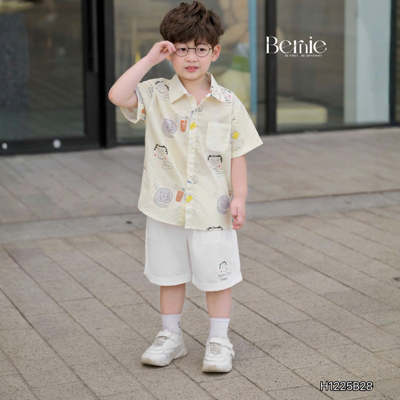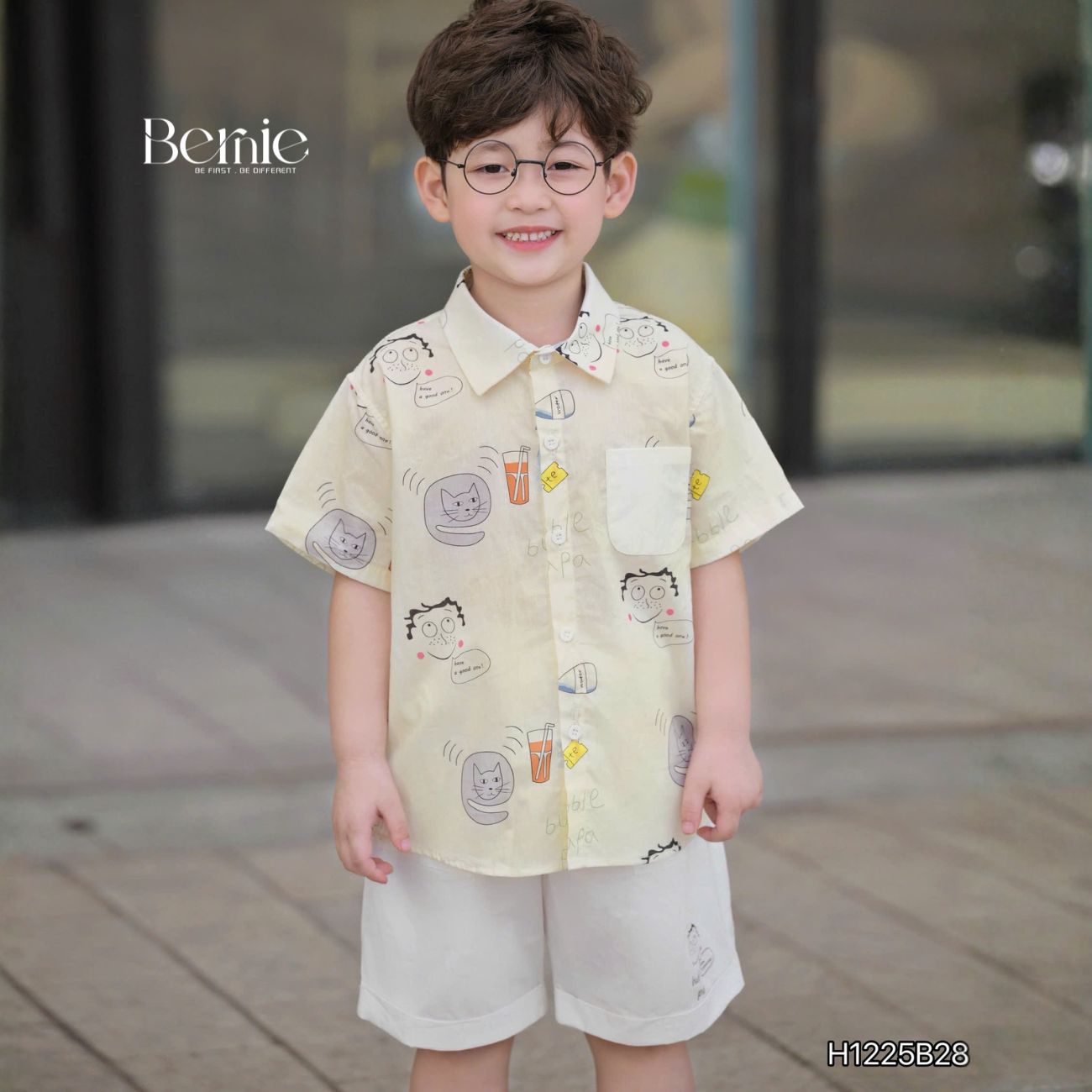 Set bộ sơ mi bé trai đi chơi đi biển áo tay ngắn họa tiết Papa Cat kèm quần short 11 tới 28kg BERNIE H1225B28