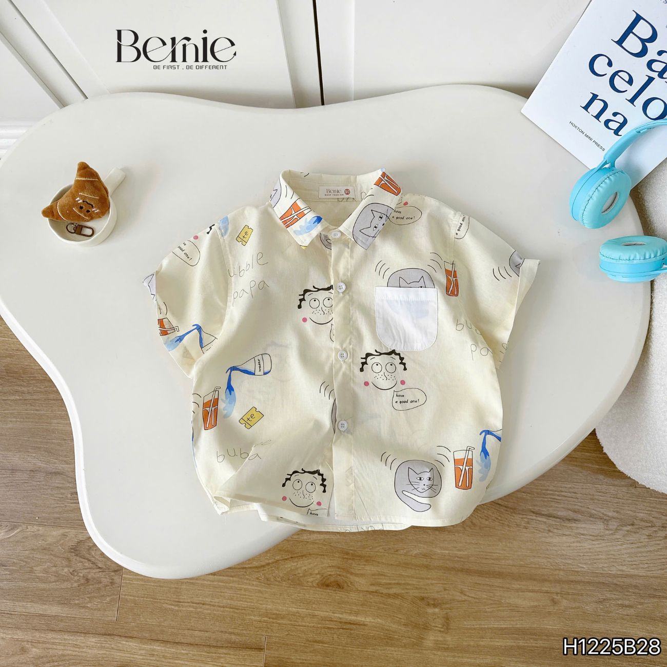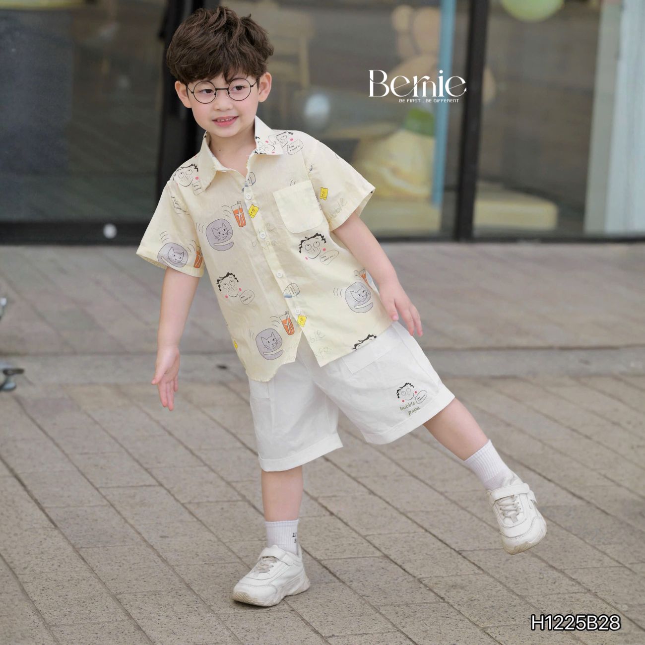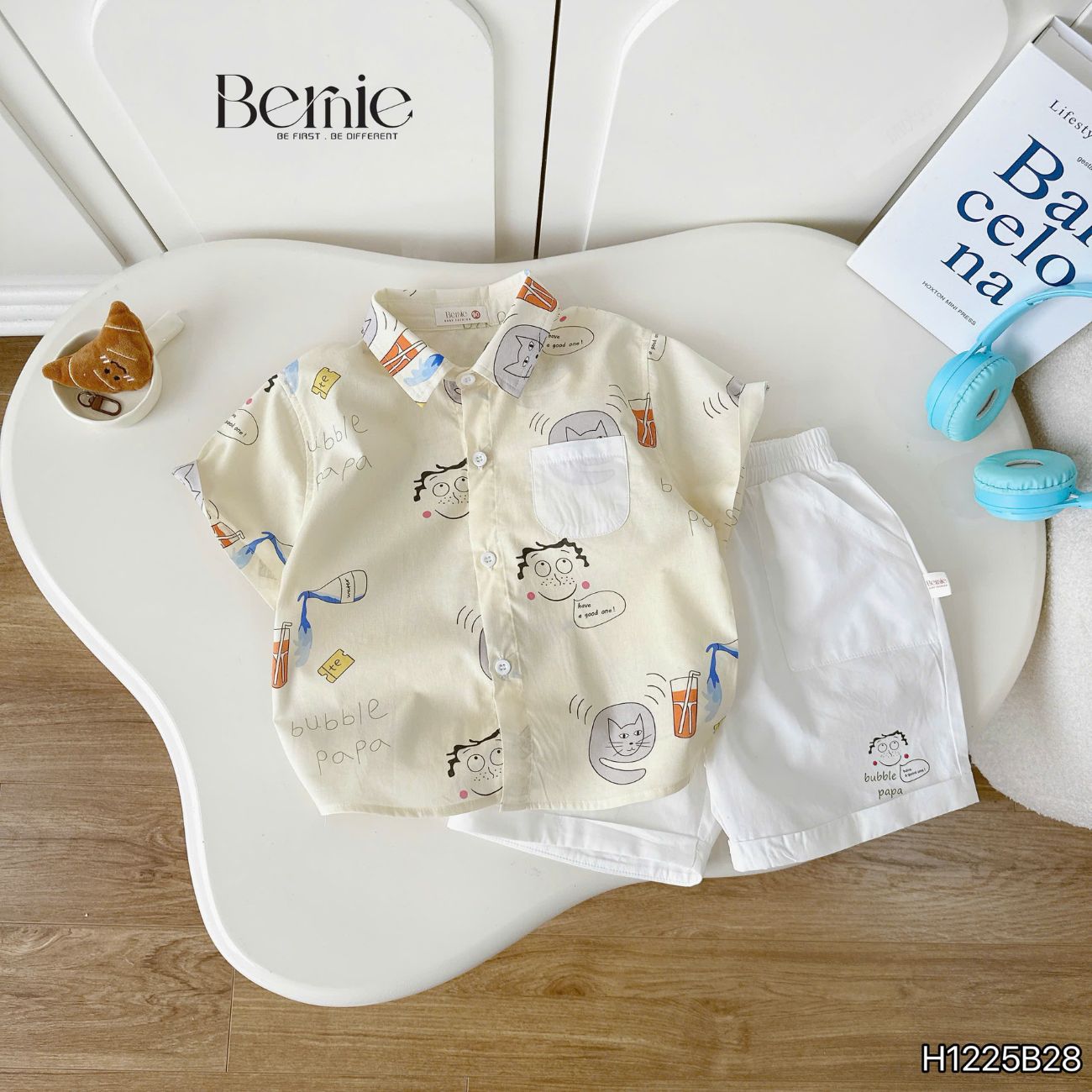 Set bộ sơ mi bé trai đi chơi đi biển áo tay ngắn họa tiết Papa Cat kèm quần short 11 tới 28kg BERNIE H1225B28