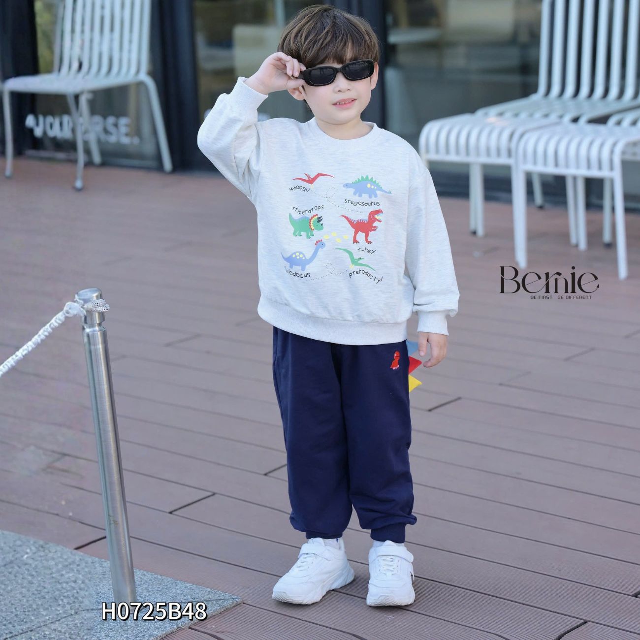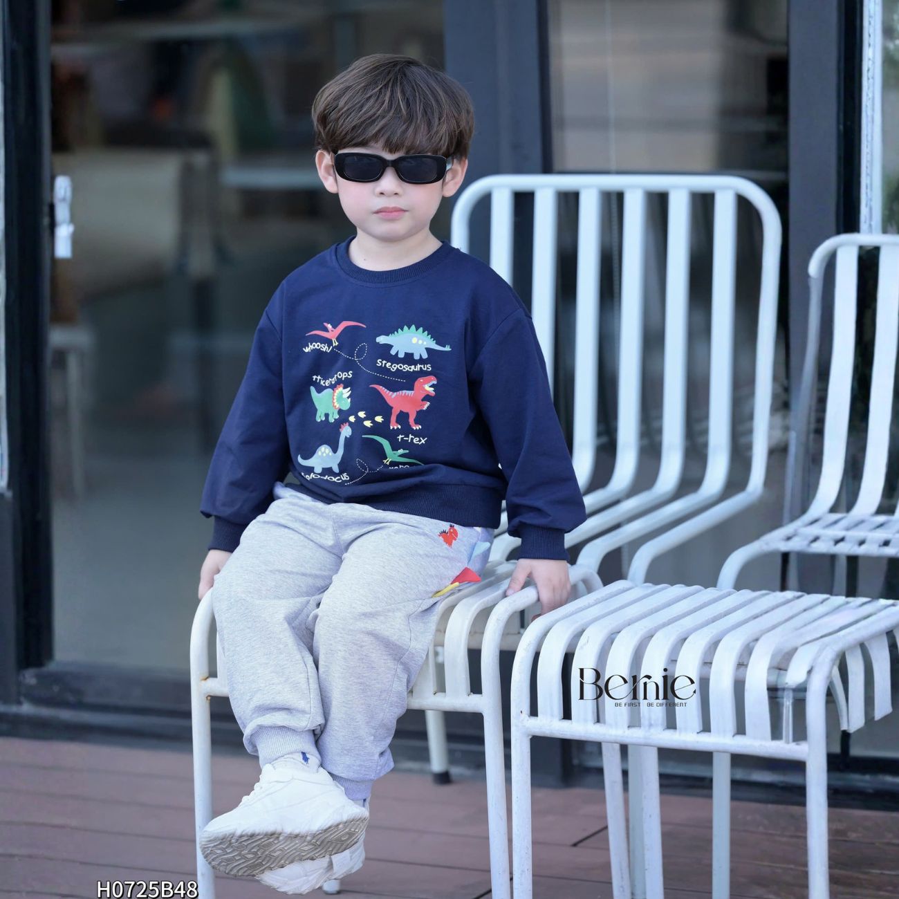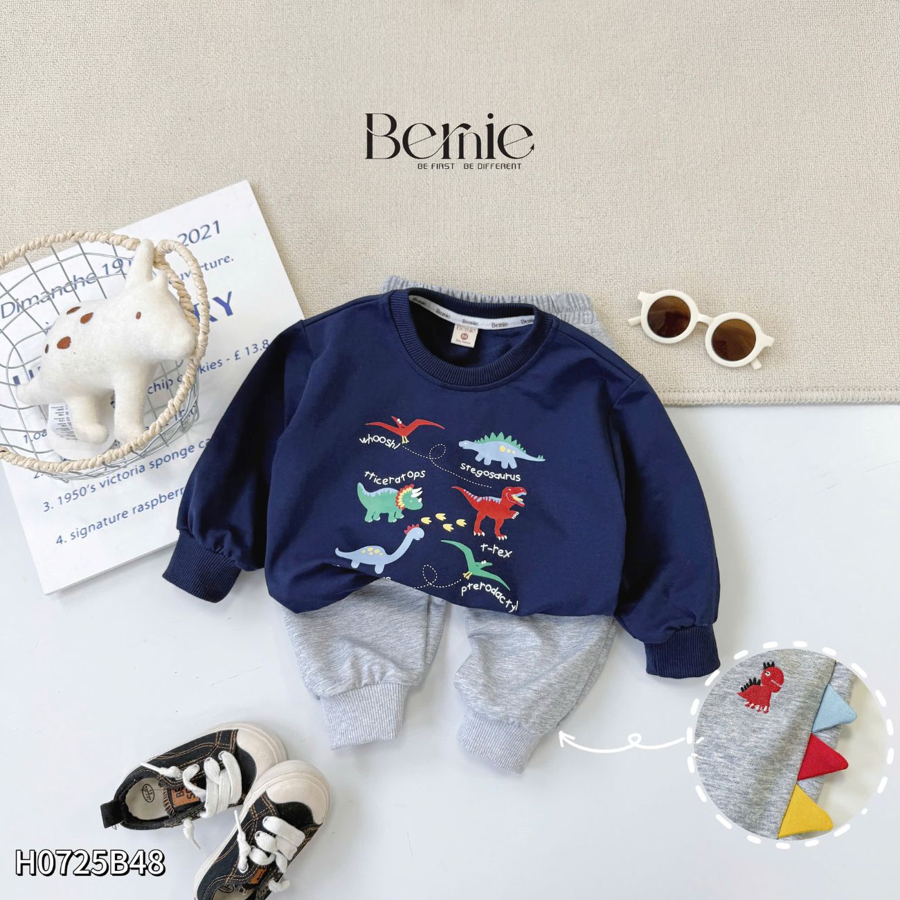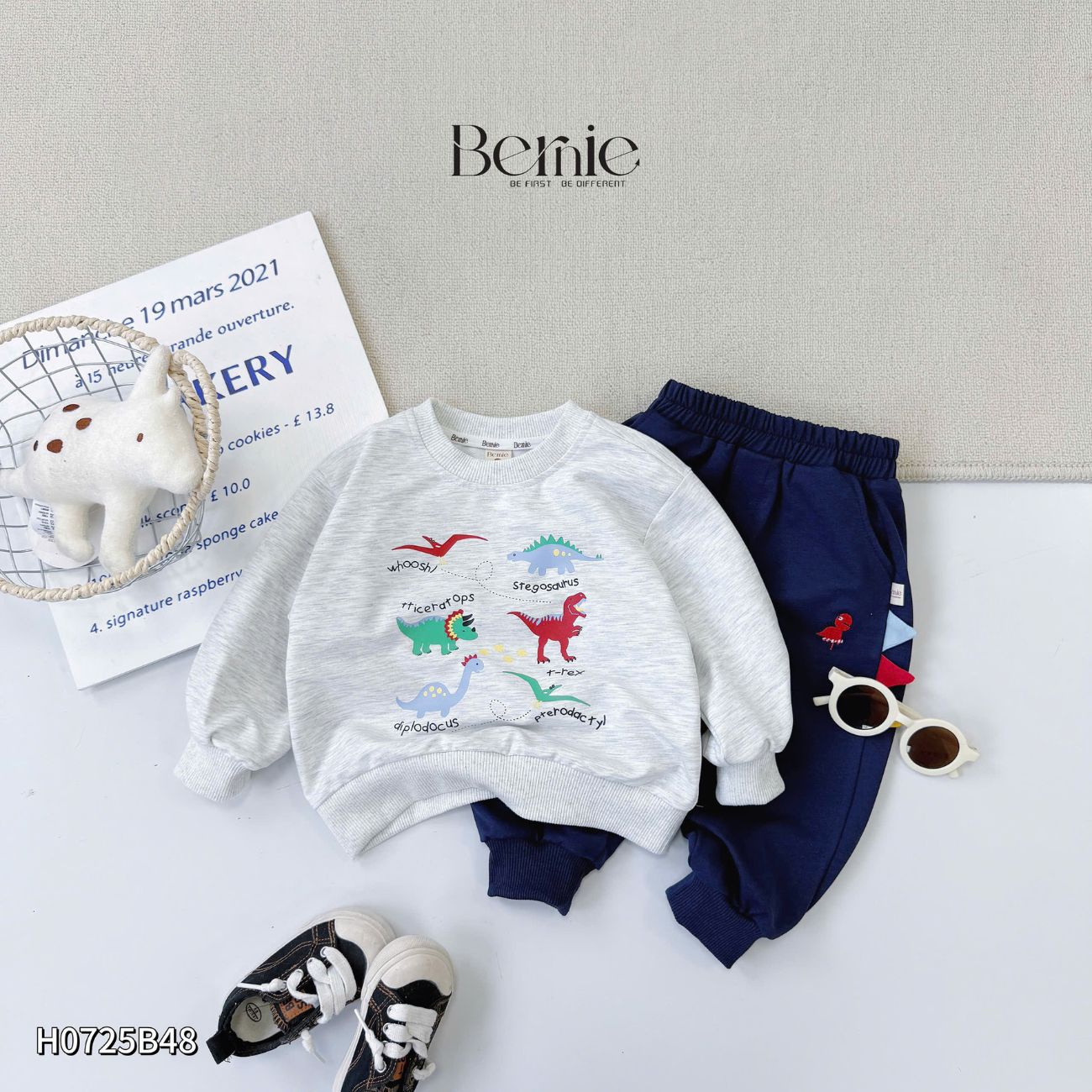- Thiết kế: Set bộ Tiny Dino thun da cá dài tay phối màu họa tiết khủng long kèm quần dài size 9 tới 28kg BERNIE H0725B48 thiết kế áo tay dài cổ tròn basic, áo dáng bomber khỏe khoắn, bo viền cổ chắc chắn, đẹp mắt. Họa tiết hình in khủng long nổi bật trendy bé nào cũng mê. Full bộ bo gấu họn gàng khoẻ khoắn. Quần dài túi thật 2 bên, may nổi hoạ tiết độc đáo , bo chun gấu gọn gàng, lưng chun mềm mại, co giãn thoải mái. Set bộ thiết kế kiểu dáng thể thao, phom dáng thoải mái cho bé vui chơi vận động.