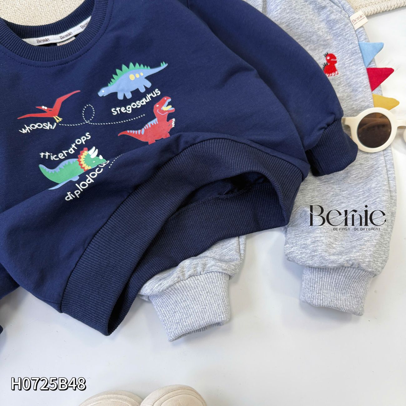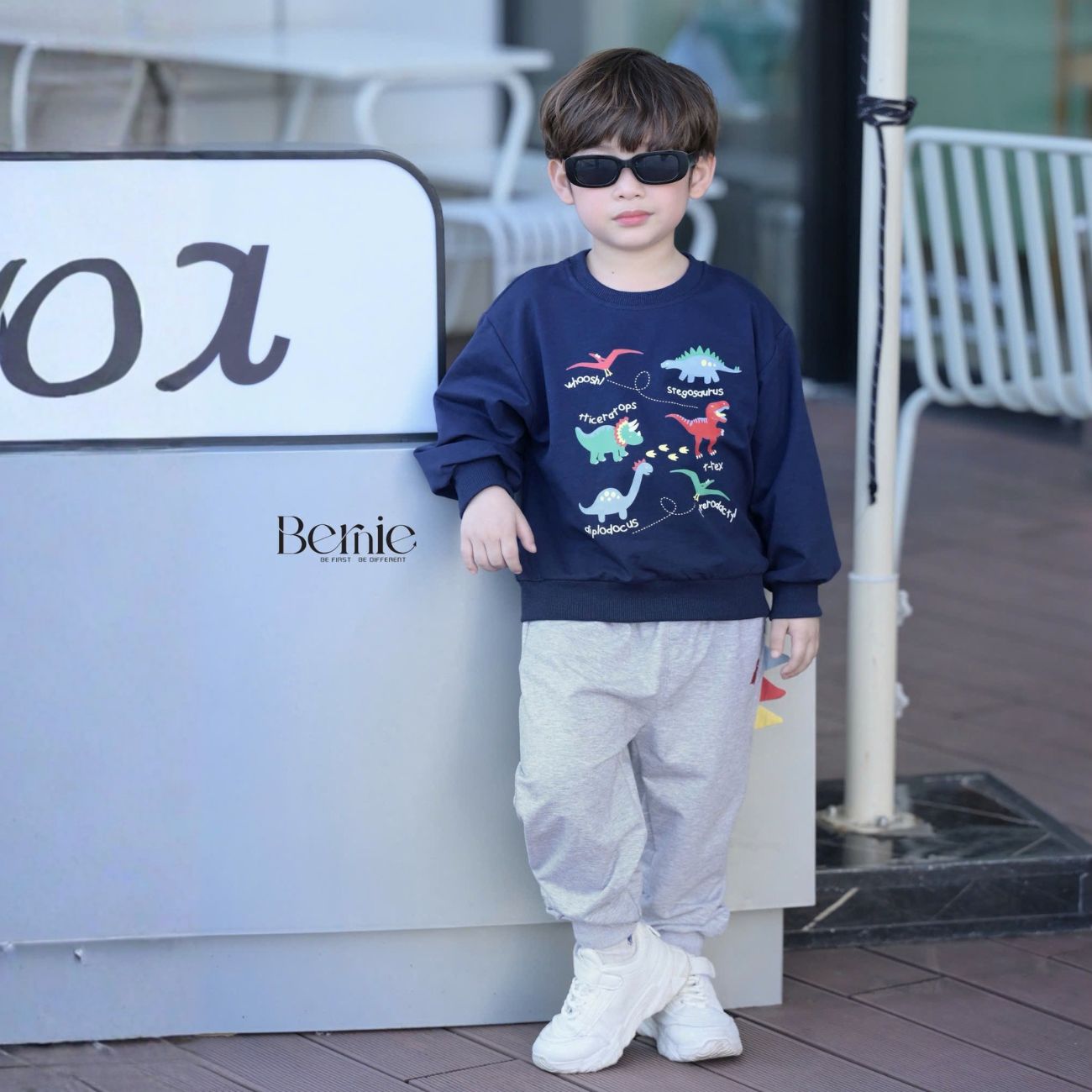 - Màu sắc: Set bộ cotton, đồ bộ tay dài raplang họa tiết khủng long cho bé trai Bernie có tone màu basic dễ mặc, ko kén da bé, với 2 màu là : Áo xanh than phối Quần ghi và Áo màu ghi phối Quần xanh than