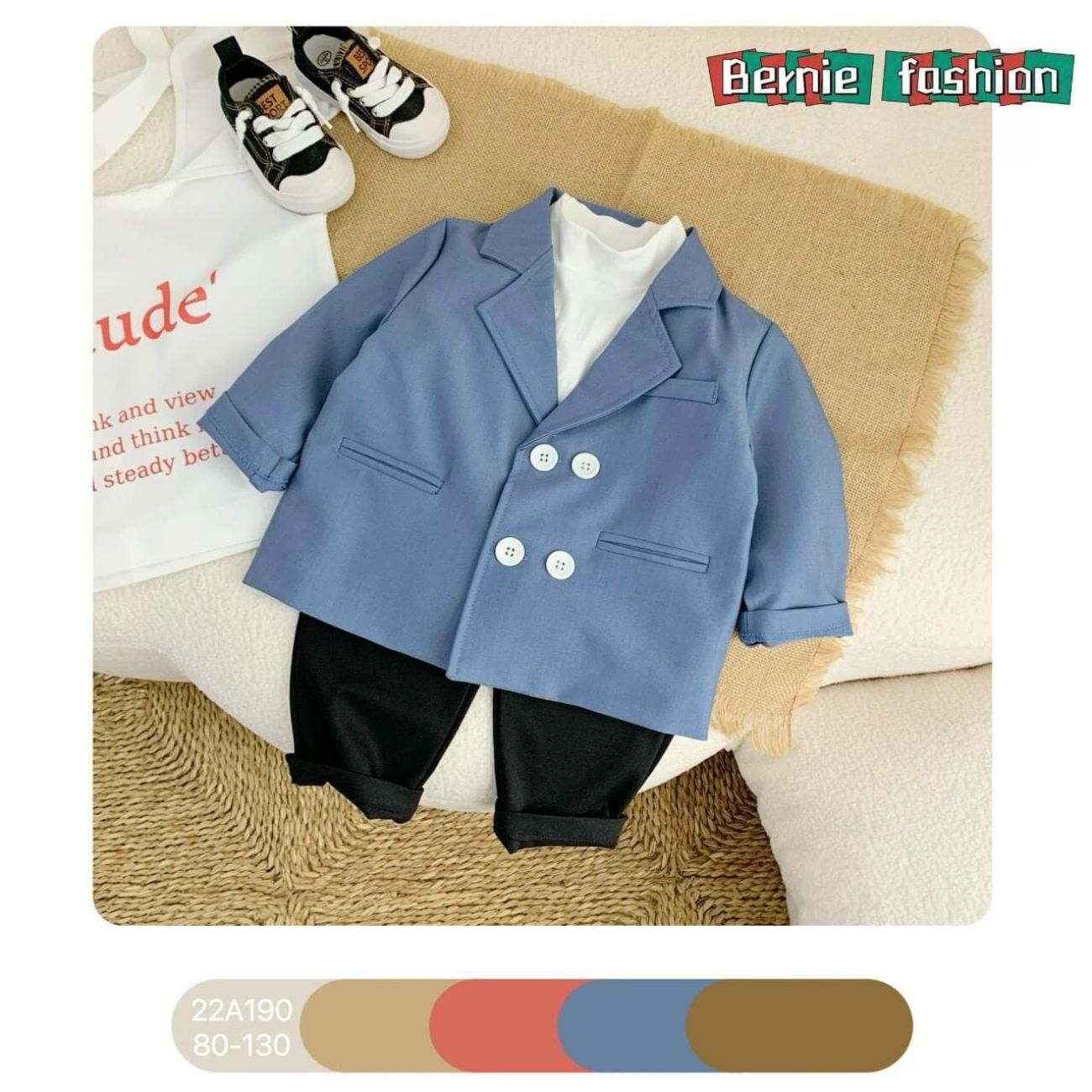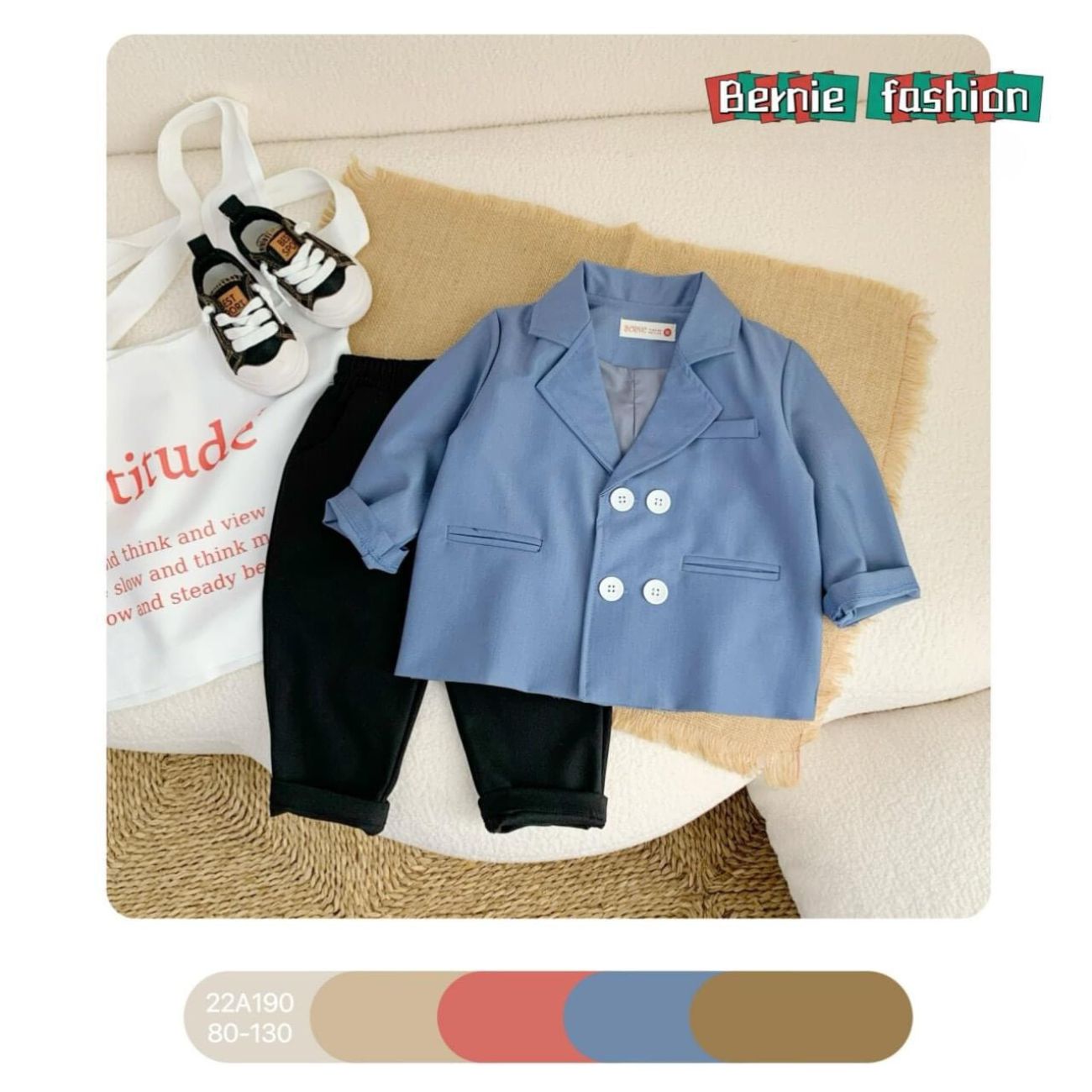 - Tên sản phẩm: Set bộ vest bé trai 4 khuy màu xanh kèm quần dài phong cách hàn quốc cho bé 9 đến 25kg BERNIE 22A190