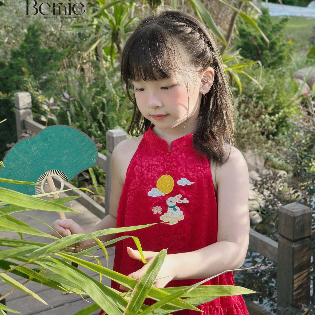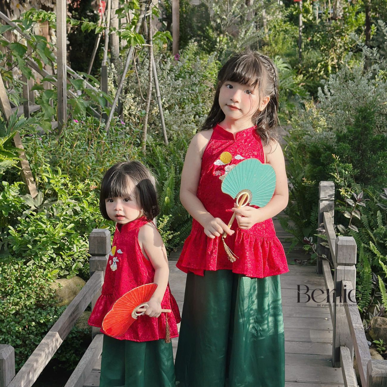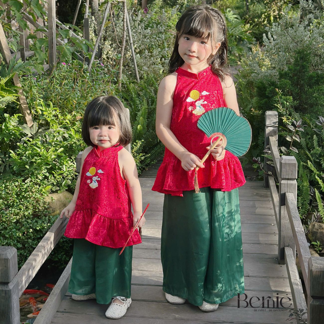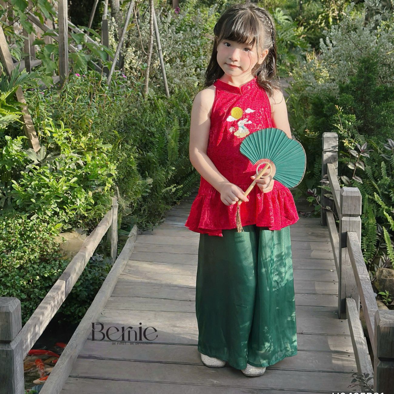 Tên sản phẩm: Set yếm lụa đỏ thêu thỏ ngọc kèm quần dài xanh tết trung thu bé gái chất lụa gấm BERNIE 1 tuổi đến 7 tuổi H0425B31